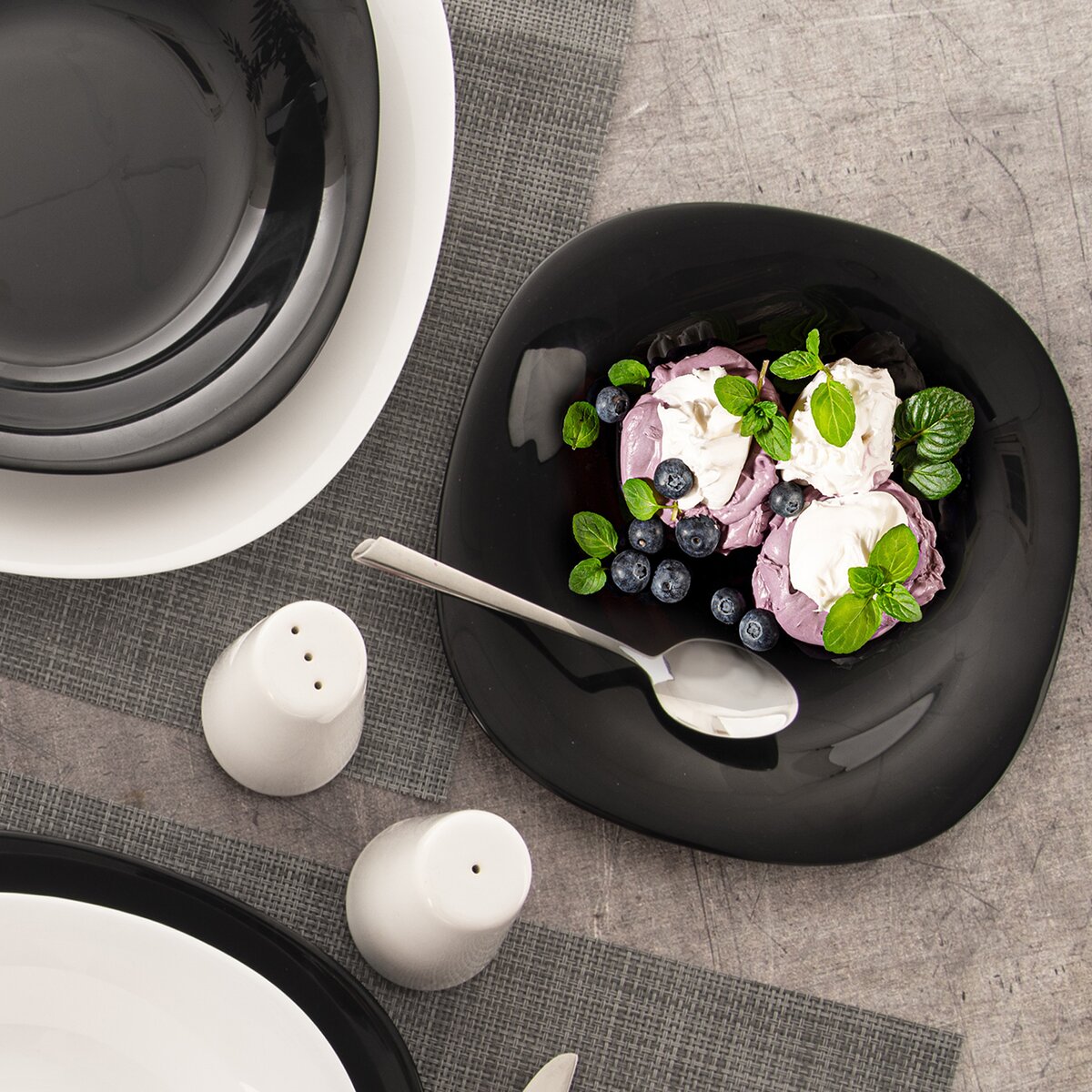 Efektní foodstyling vynikne i díky hranatému, zaoblenému tvaru talíře, lze jej kombinovat s dalšími typy talířů z kolekce LUNA.