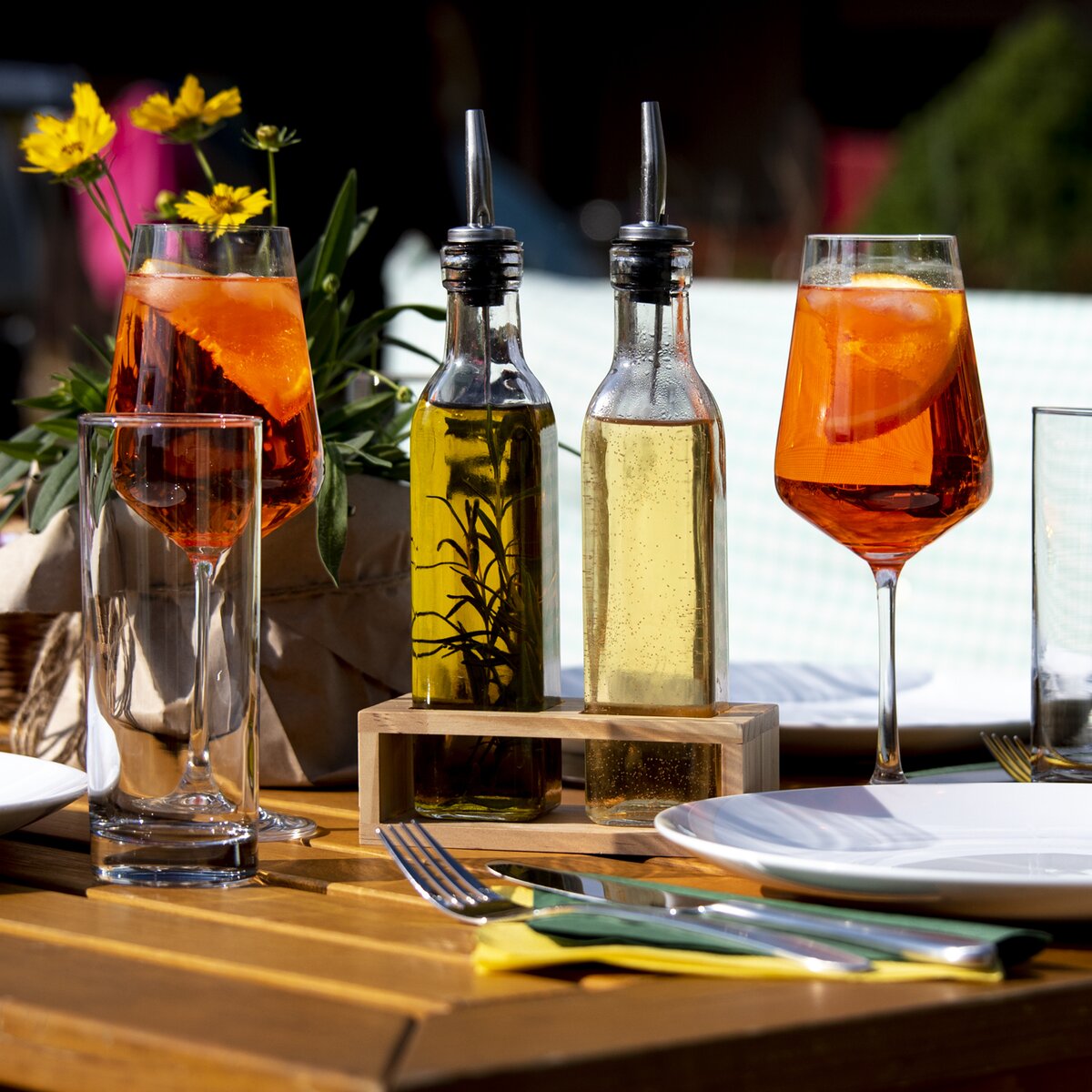 Dochucovací sada najde své místo nejen na kuchyňské lince, ale i jídelním stole. Tvoří ji dvě skleněné lahve o objemu 300 ml, které jsou určené na olej a ocet. K jejich snadnějšímu nalévání slouží dvě kovové výlevky.