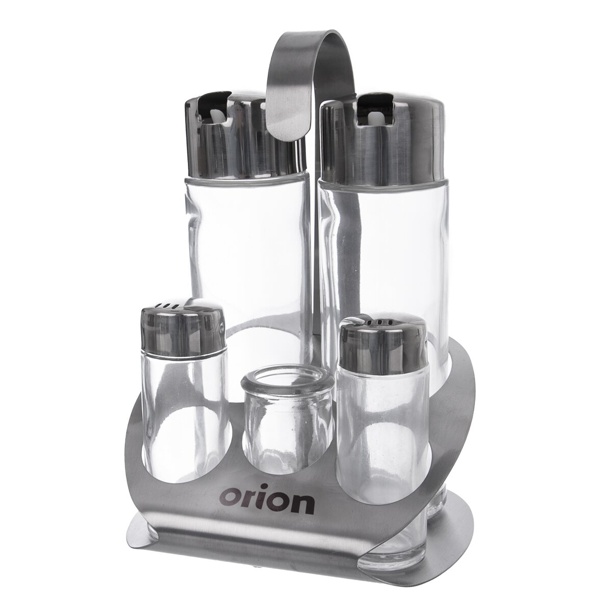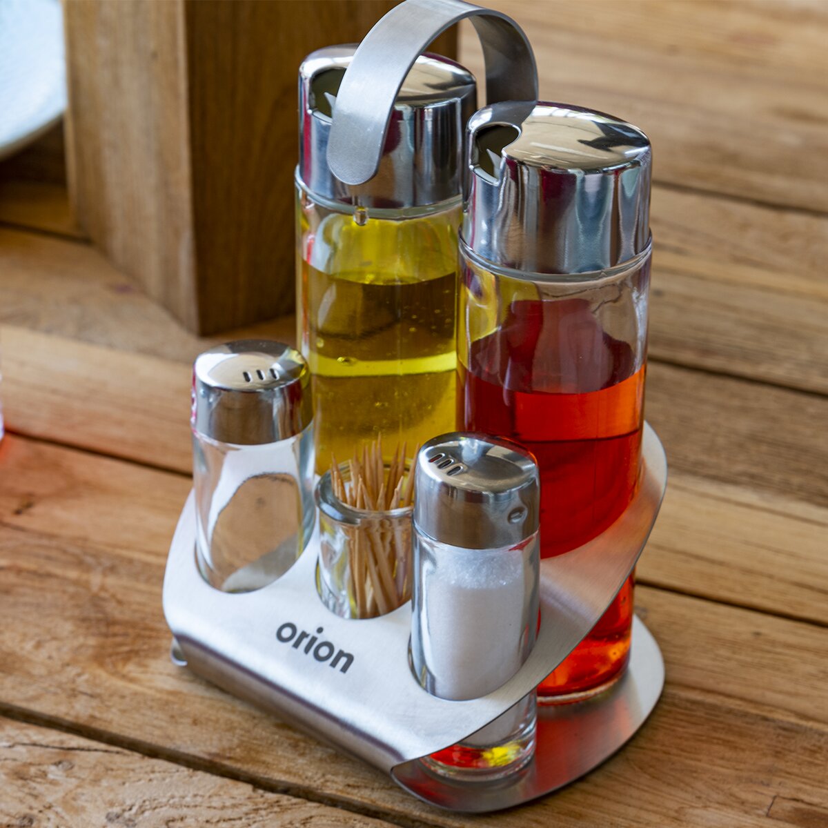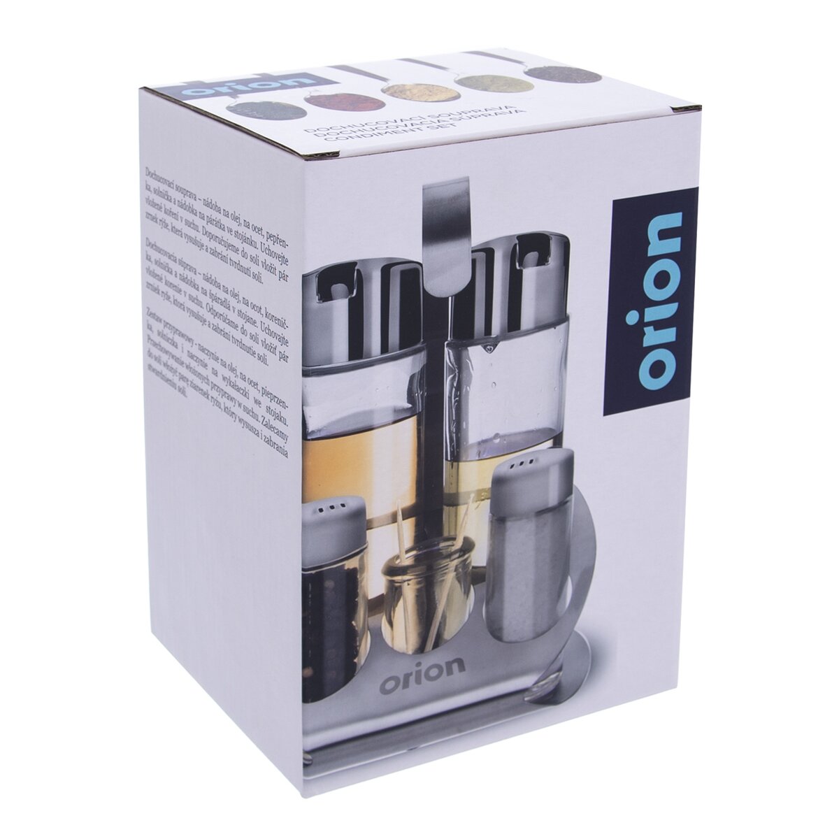 Kód produktu 152366Dochucovací souprava složená ze skleněné nádoby na olej a ocet, pepřenky, solničky, a nádobky na párátka. Všechny mají plastové uzávěry a jsou uloženy do nerezového stojánku.