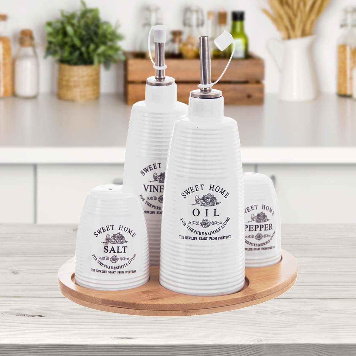 Součástí soupravy jsou také dvě keramické láhve na olej a ocet, které mají plastový uzávěr a nerezové nálevky usnadňující jejich dávkování. Jemné vroubkování a elegantní bílá barva dělají z nádob stylové kousky hodící se do každé kuchyně. A abyste je mohli snadněji přenést, najdete v soupravě také podnos z bambusového dřeva.