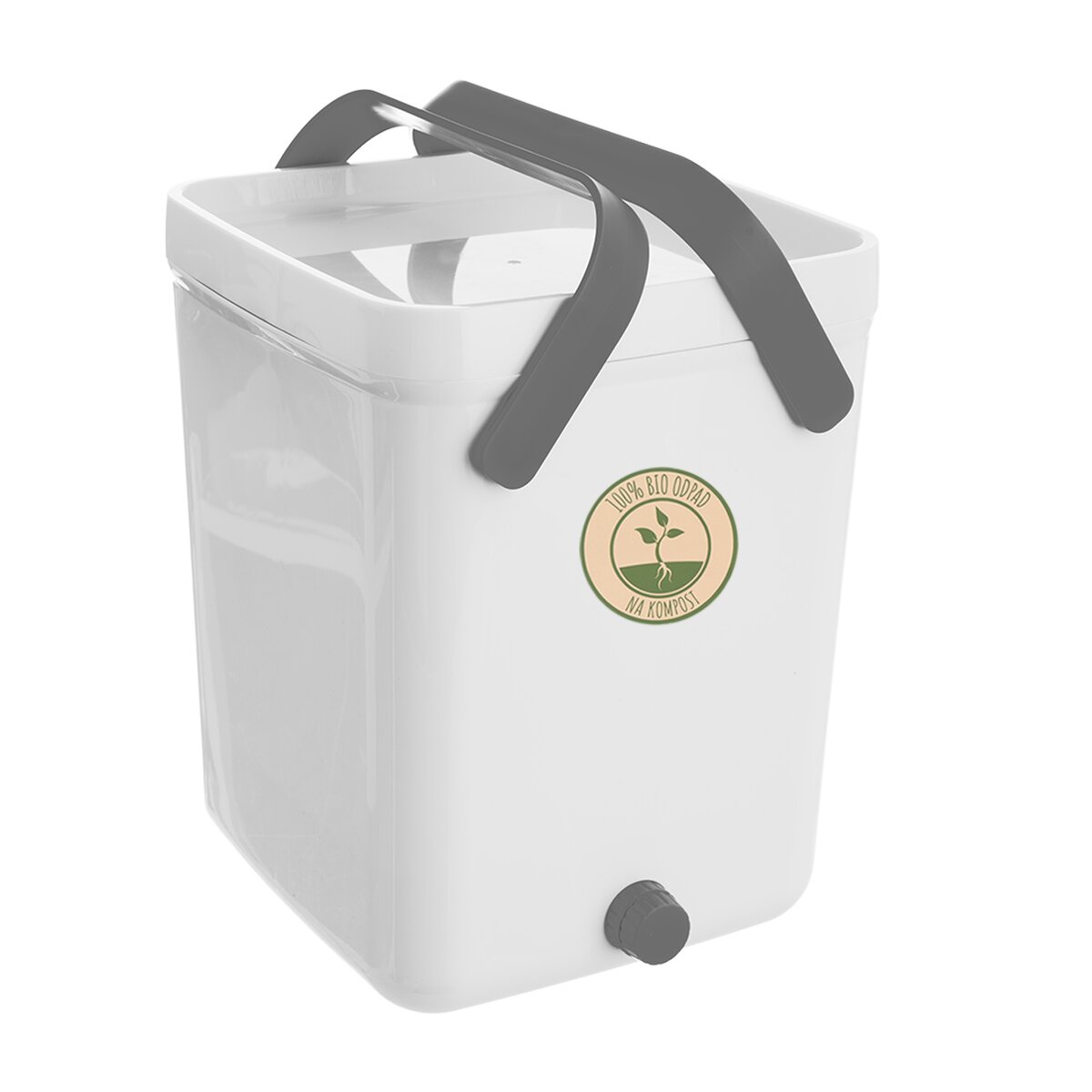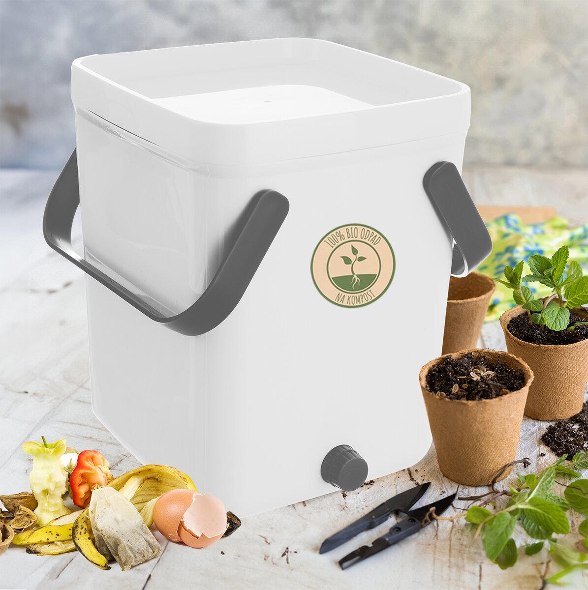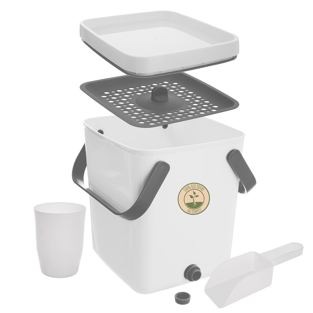 Díky praktickým sklopným uchům snadno přenesete. Součástí výrobku je lopatka, kelímek na tekutinu a sítko. Po vyprázdnění kompostér opláchněte vodou (bez saponátů a mýdel) a nechte důkladně vyschnout. Po vysušení je opět připraven k použití. Díky těsnícímu víku můžete mít kompostér doma například v kuchyni pod dřezem. Do kompostéru nevkládejte: mléko, džus, olej, ocet, vodu, velké kosti, popel, papír, zvířecí exkrementy.