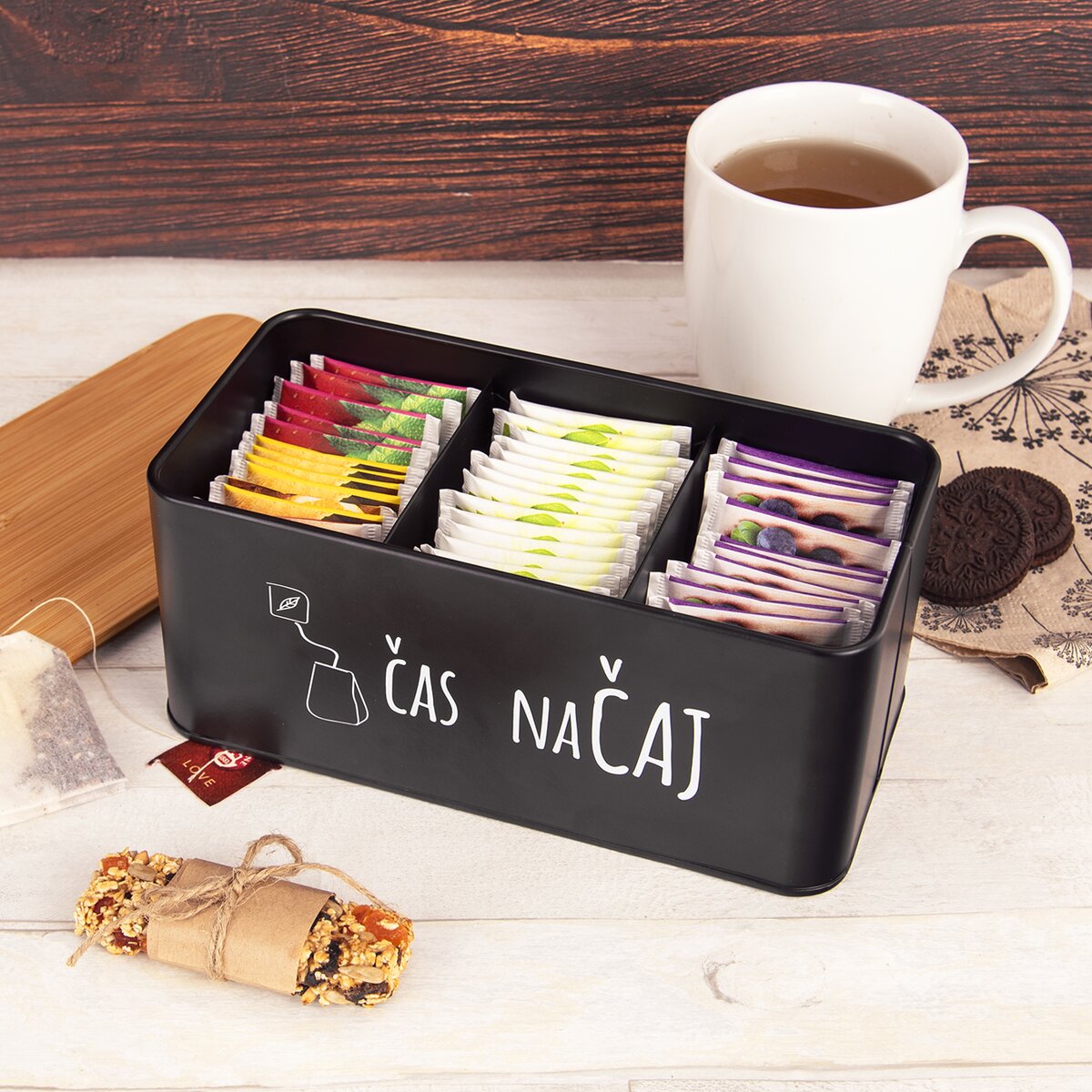 Kód produktu 127562Černá plechová dóza BLACK s nápisem ČAS NA ČAJ slouží díky 3 odděleným přihrádkám a bambusovému víčku k přehlednému uložení čajů v sáčcích.
