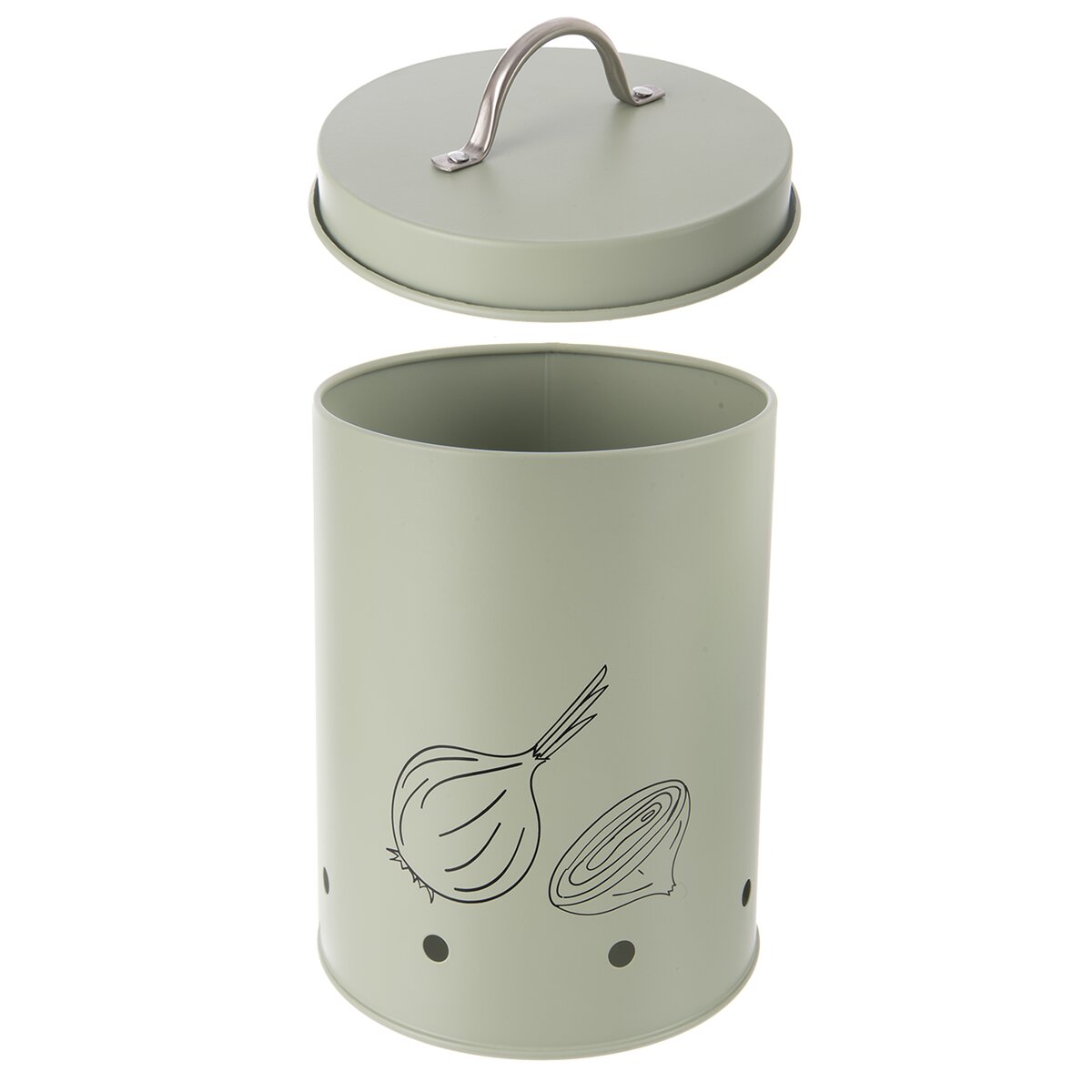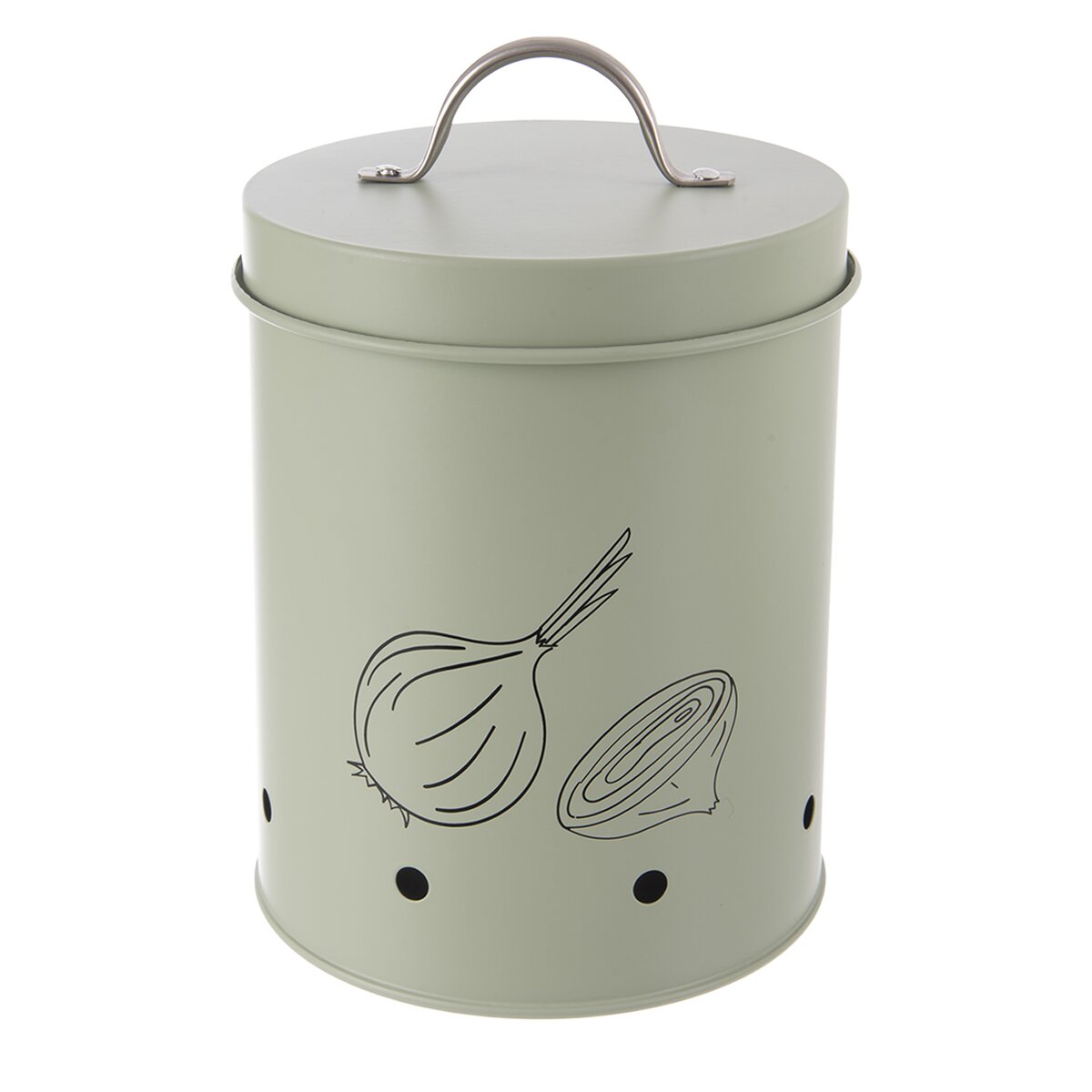 Kód produktu 127908Dóza GREENISH je určena k uložení cibule, bude tak správně skladována, navíc má otvory pro cirkulaci vzduchu a praktické víčko s držadlem.