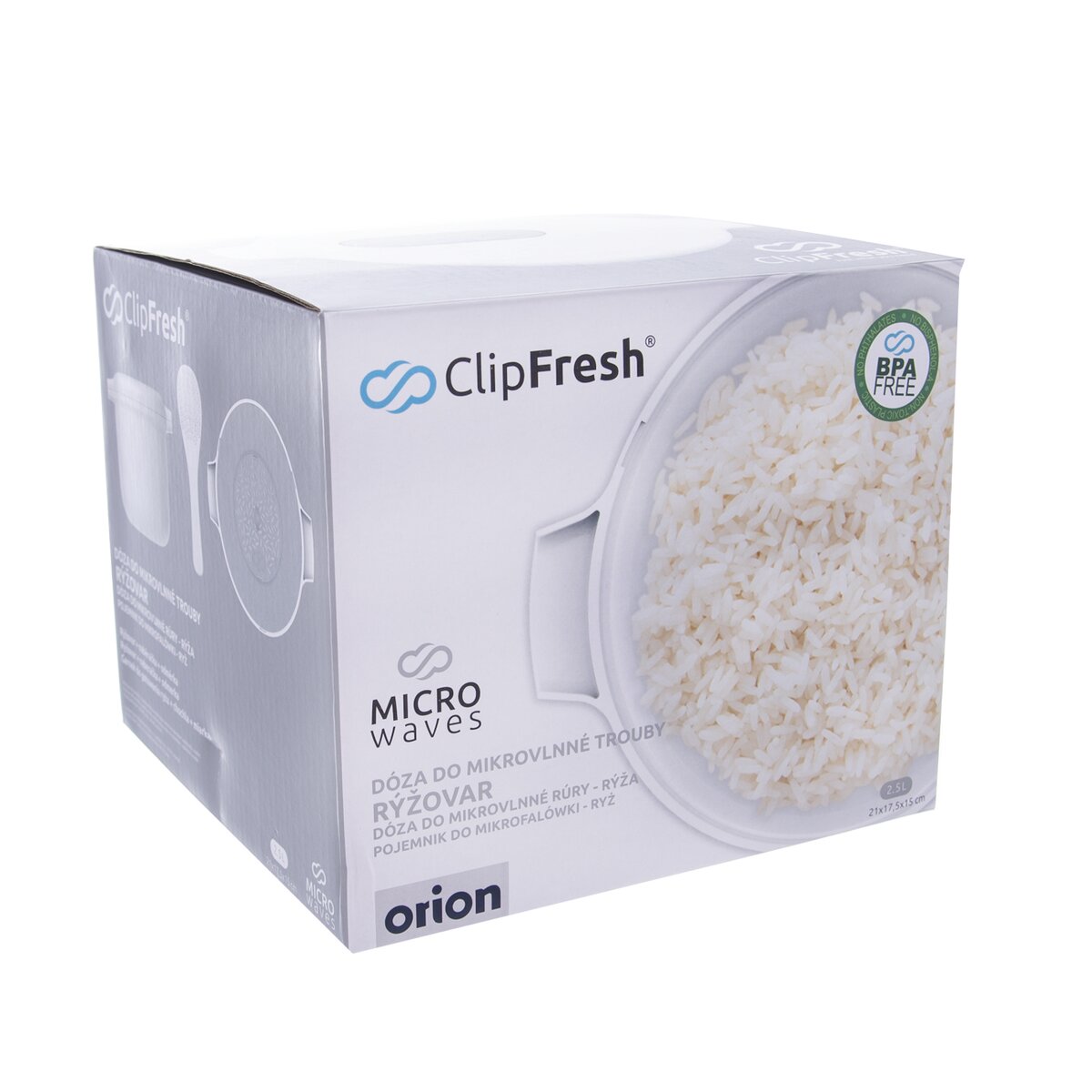 Uvařte si oblíbenou rýži v mikrovlnné troubě během několika minut v rýžovaru ClipFresh. Vložíte rýži a vodu, uzavřete víkem, povolíte ventil, umístíte do mikrovlnné trouby a za několik málo minut je rýže hotová. Rychlé, snadné a bezpečné vaření. Součástí odměrka a lopatka na dávkování. Materiál: kvalitní plast bez PBA. Vhodný do myčky na nádobí, MVT, chladničky i mrazničky (-20 °C až 120 °C). Rozměry: objem 2,5 l, 21x17,5x15 cm. Návod postupu je součástí balení.