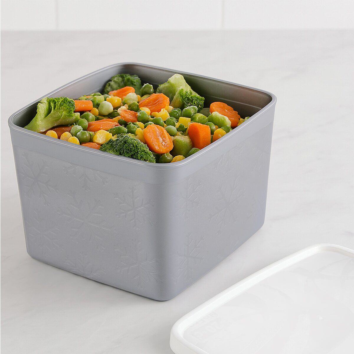 Kód produktu 127917Plastová dóza FROST o objemu 1,1 l má šedý odstín s dekorem vloček. Vhodná k ukládání potravin v mrazničce a chladničce.