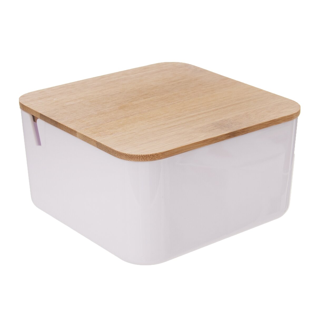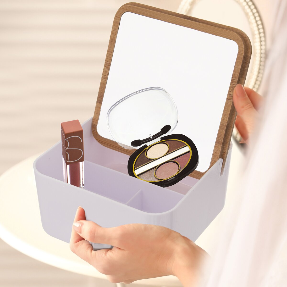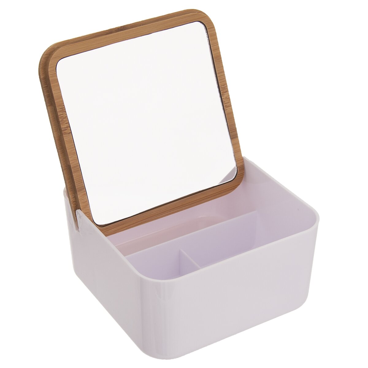 Šikovná plastová dóza s víčkem na uložení dekorativní kosmetiky. Na vnitřní straně bambusového víčka je zrcátko, které poskytuje možnost nalíčení obličeje kdekoli, nejen v koupelně. Využijete ji doma i na cestách.