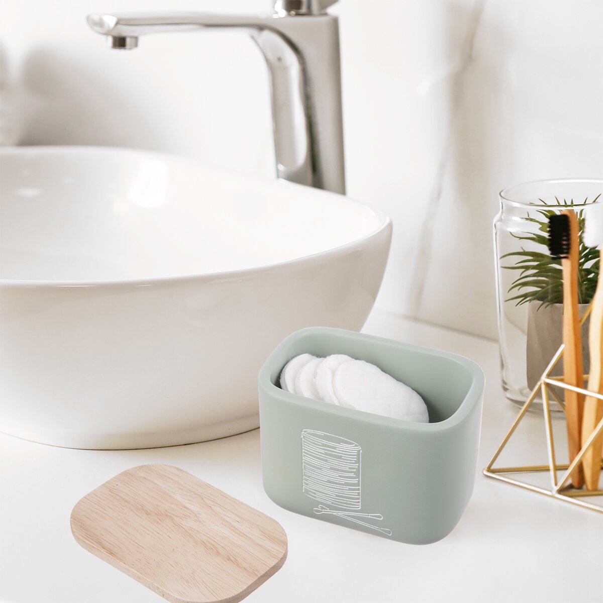 Elegantní pomocníci z kolekce GREENISH budou užiteční i v koupelně. Dóza v příjemné zelené barvě se hodí k uložení odličovacích tamponů nebo vatových tyčinek, které budou vždy po ruce. Skryté, ale přesto nadosah.