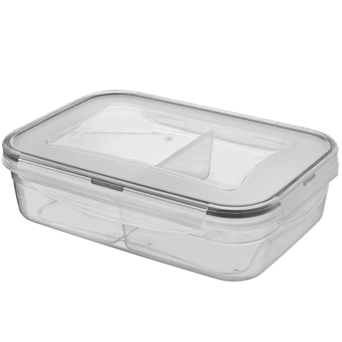 Kód produktu 127156Transparentní plastová hranatá dóza se dvěma menšími miskami o celkovém objemu 1 l, ideální k převážení oběda, svačiny nebo uložení hotových pokrmů v chladničce i mrazničce. Pevné uzavření zajistí silikonové těsnění a klipy na víčku.