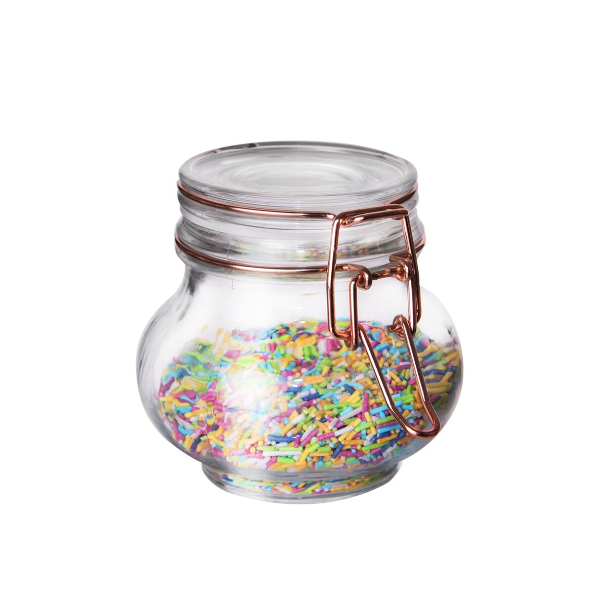 Dóza s pevným patentním uzavíráním a s těsněním. Materiál: sklo, silikonové těsnění, kovová přezka. Rozměry: objem 0,25 l, pr. 9 cm, v. 8,5 cm.