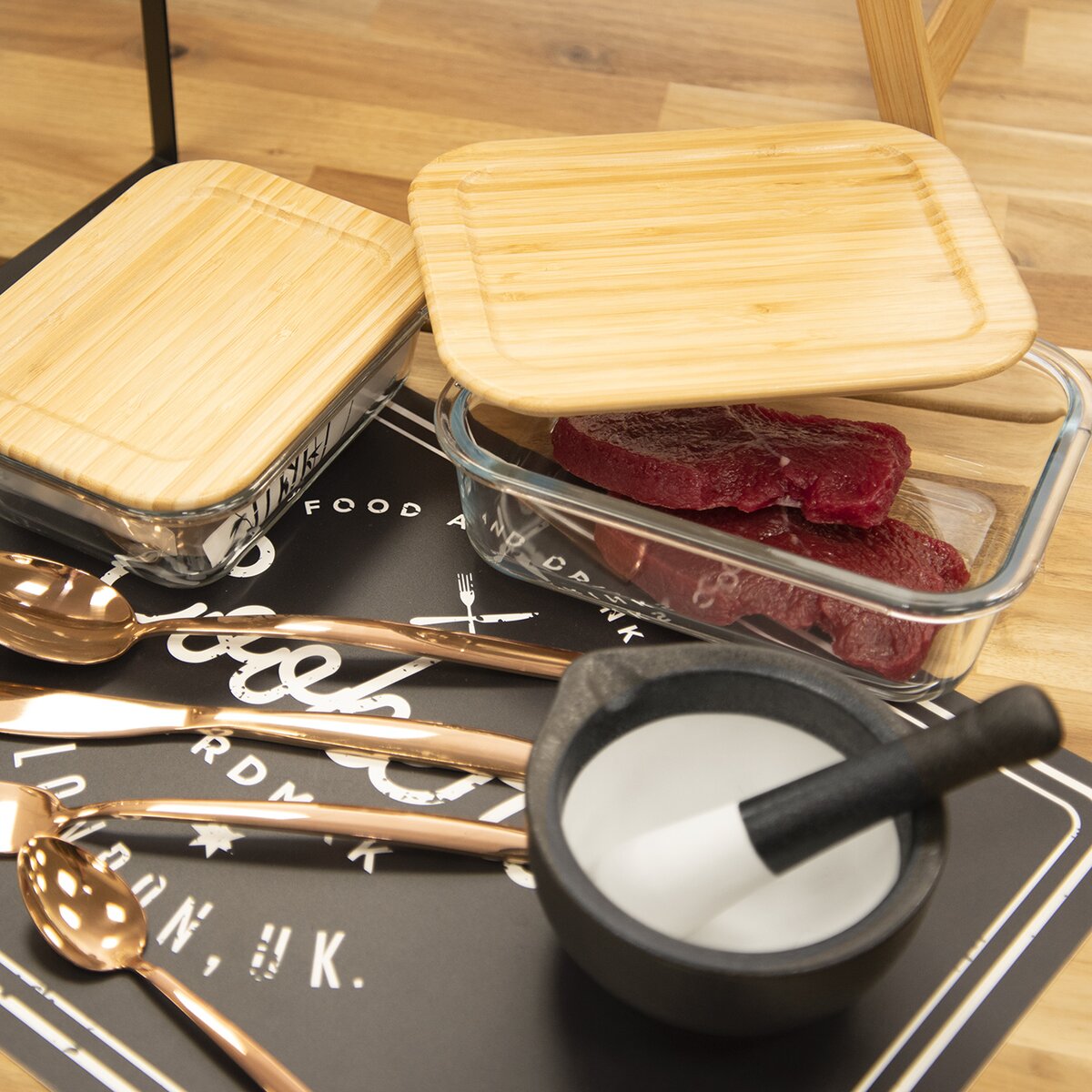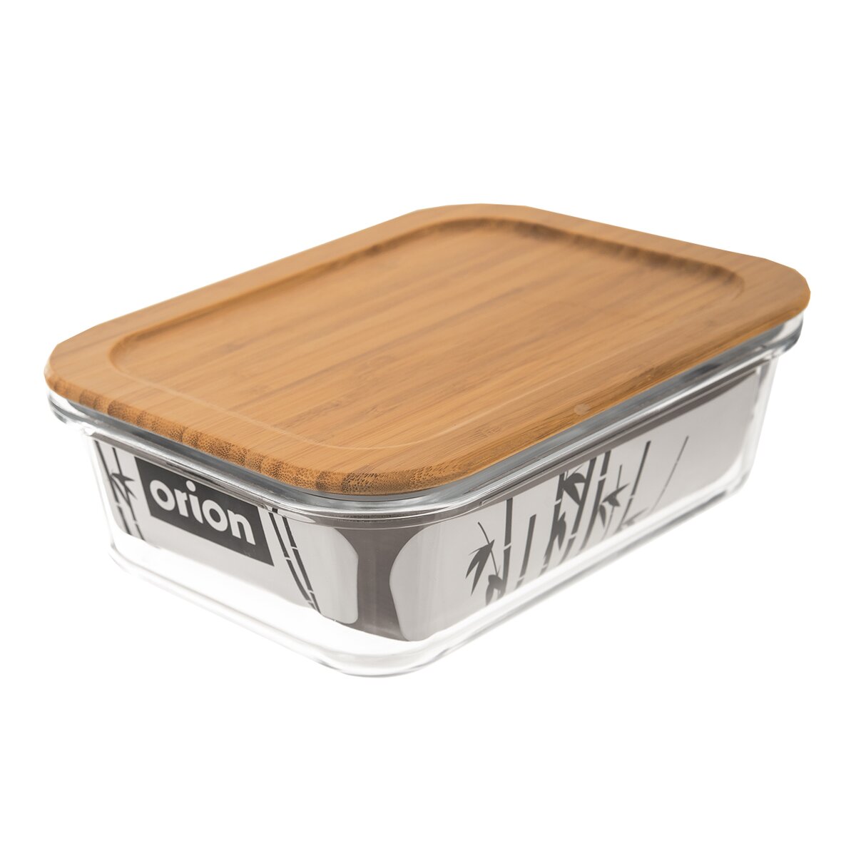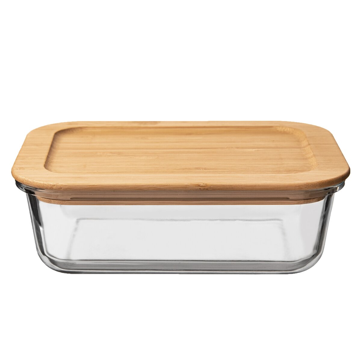 Kód produktu 127549Obdélníková dóza z borosilikátového skla o objemu 1,6 l, s bambusovým víčkem opatřeným silikonovým těsněním pro uložení, ohřívání i zapékání oblíbených pokrmů.