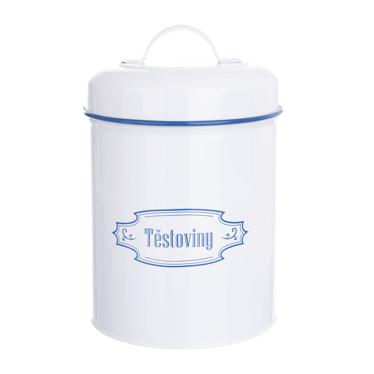 Kód produktu 153650Stylová kulatá plechová dóza s modrým nápisem TĚSTOVINY a praktickým víčkem.