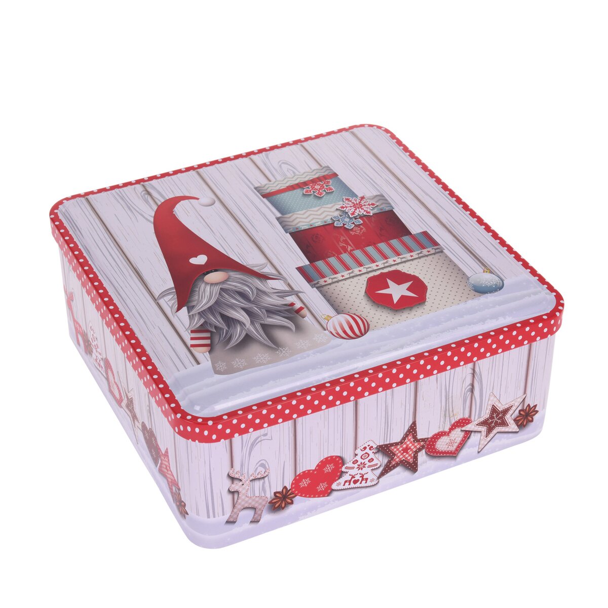 Kód produktu 127526Dóza s víkem na uložení cukrovinek i jiných potravin. Materiál: plech. Rozměry: 20x20x8 cm.