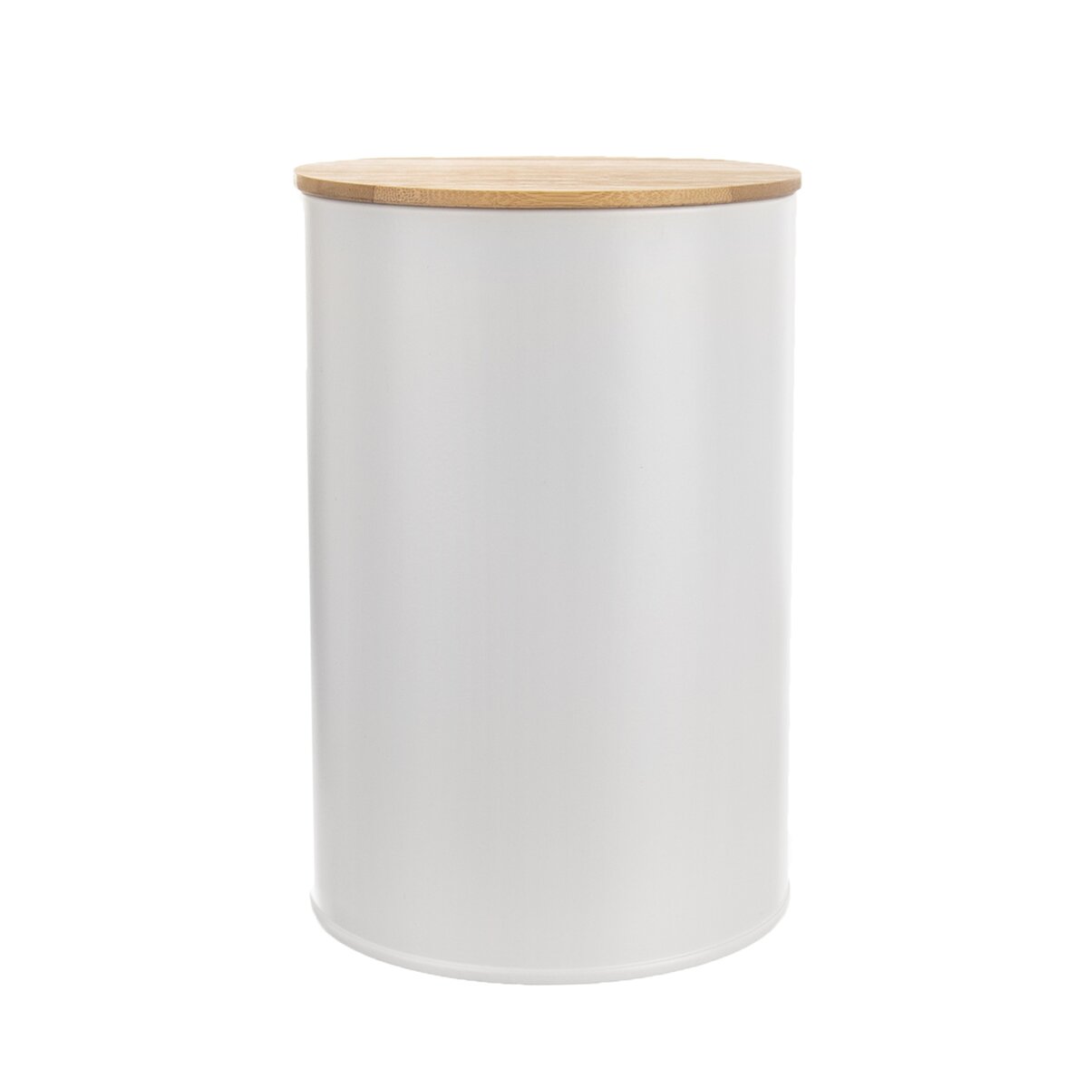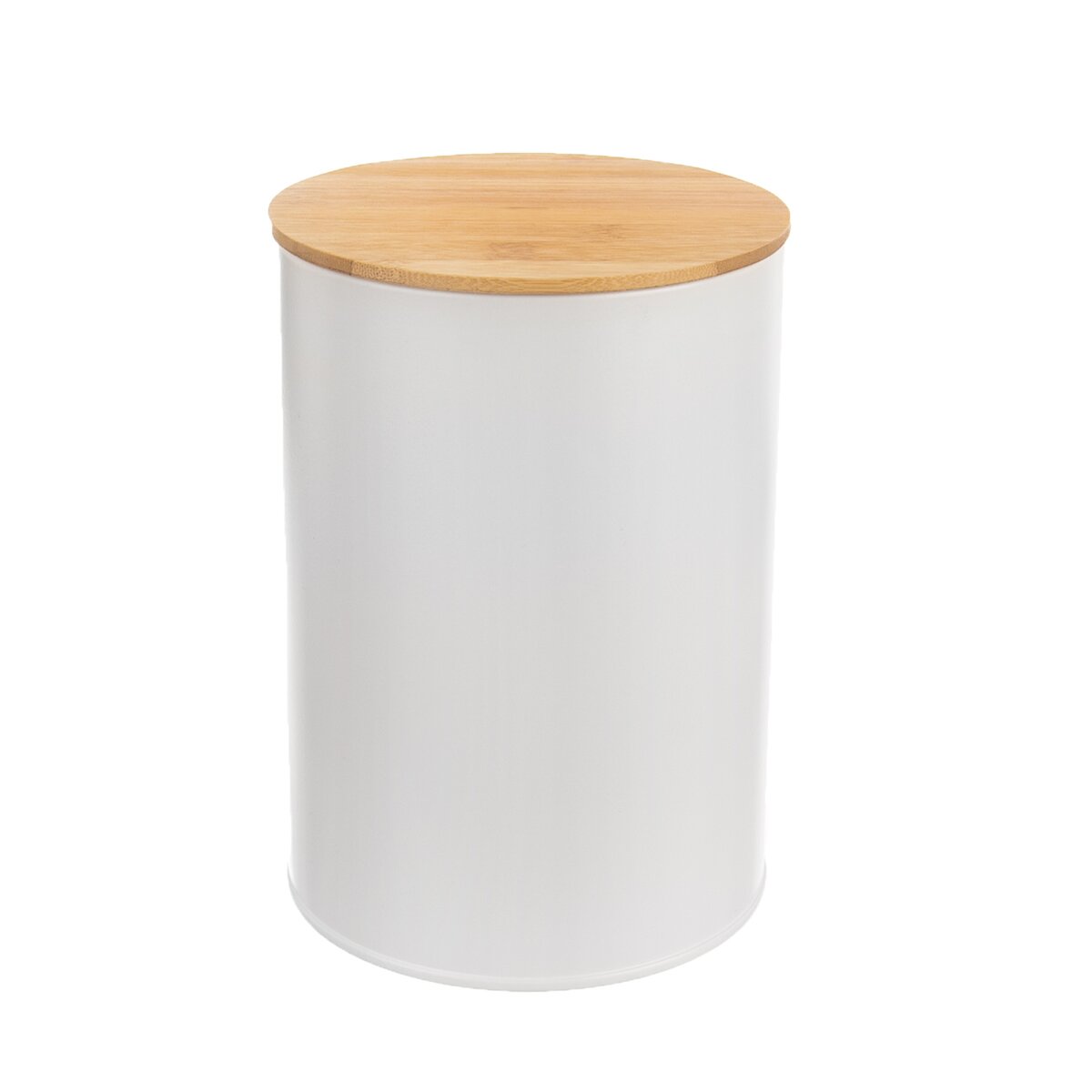 Kód produktu 127540Plechová bílá dóza o objemu 1,3 l, s bambusovým víčkem a silikonovým těsněním, vhodná k uložení mouky, těstovin, rýže a jiných sypkých surovin.