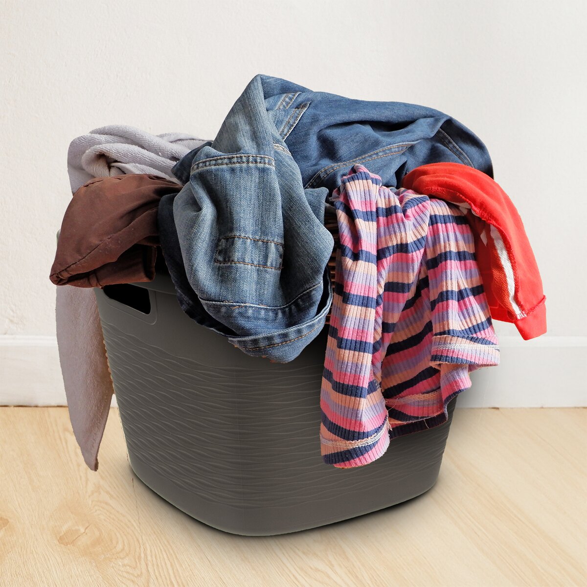 Moderní vzhled dřezu s jemnou strukturou je určen na přenášení špinavého i čistého prádla a bude díky tlumené, tmavě šedé barvě ladit s interiérem moderní i tradiční koupelny.