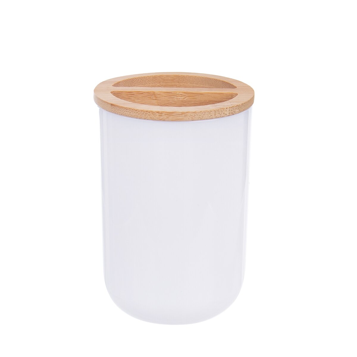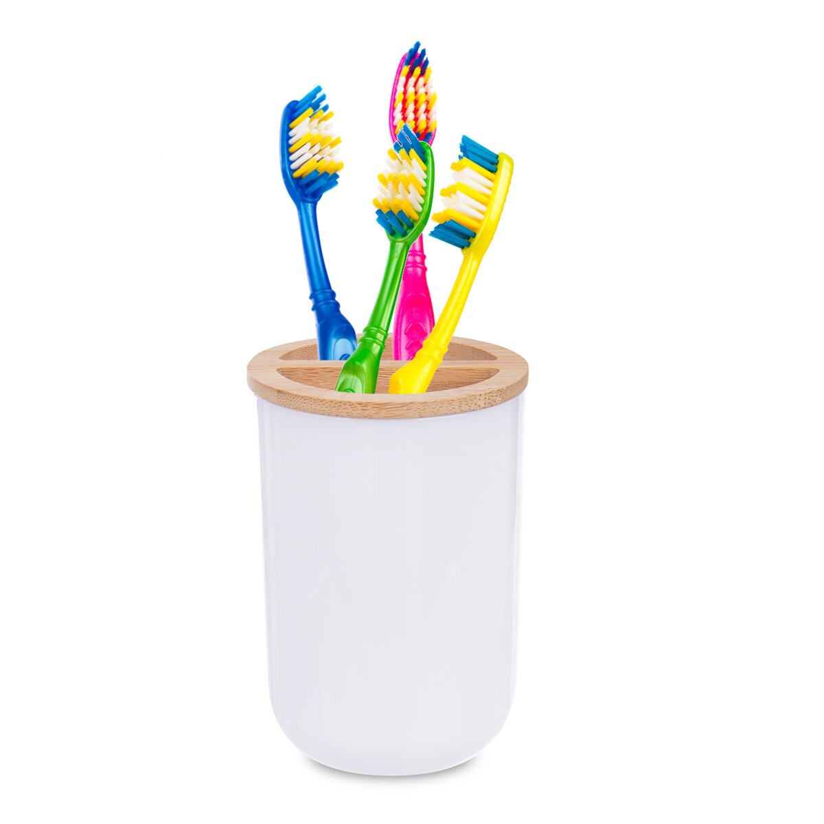 Konec povalování zubních kartáčků a zubní pasty po umyvadle. Tento decentní, jednoduchý kelímek bílé barvy s bambusovým víčkem vám pomůže mít všechny oblíbené výrobky hezky po ruce. Na jedné straně třeba zubní pasta, v druhé části kartáčky všech členů vaší rodiny.