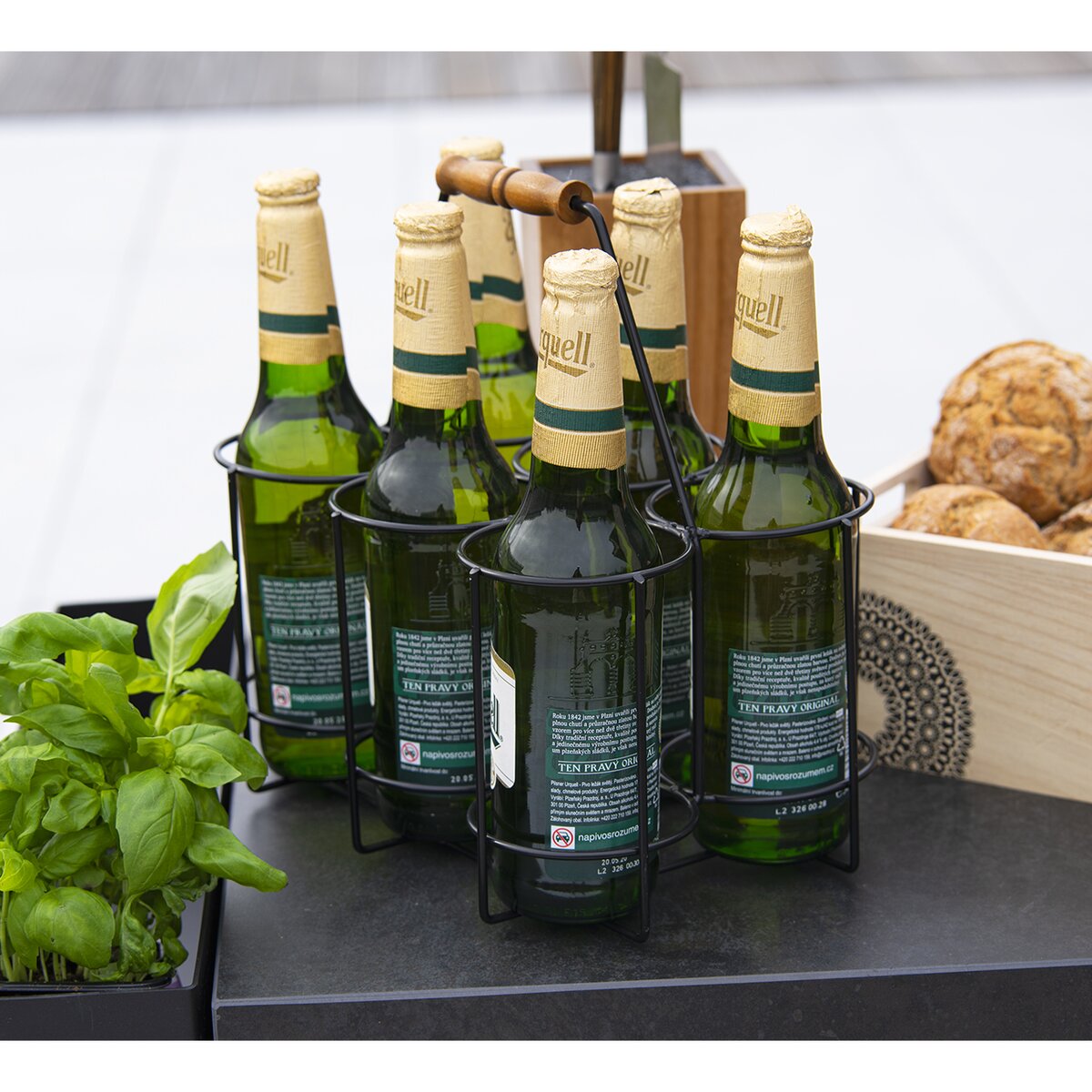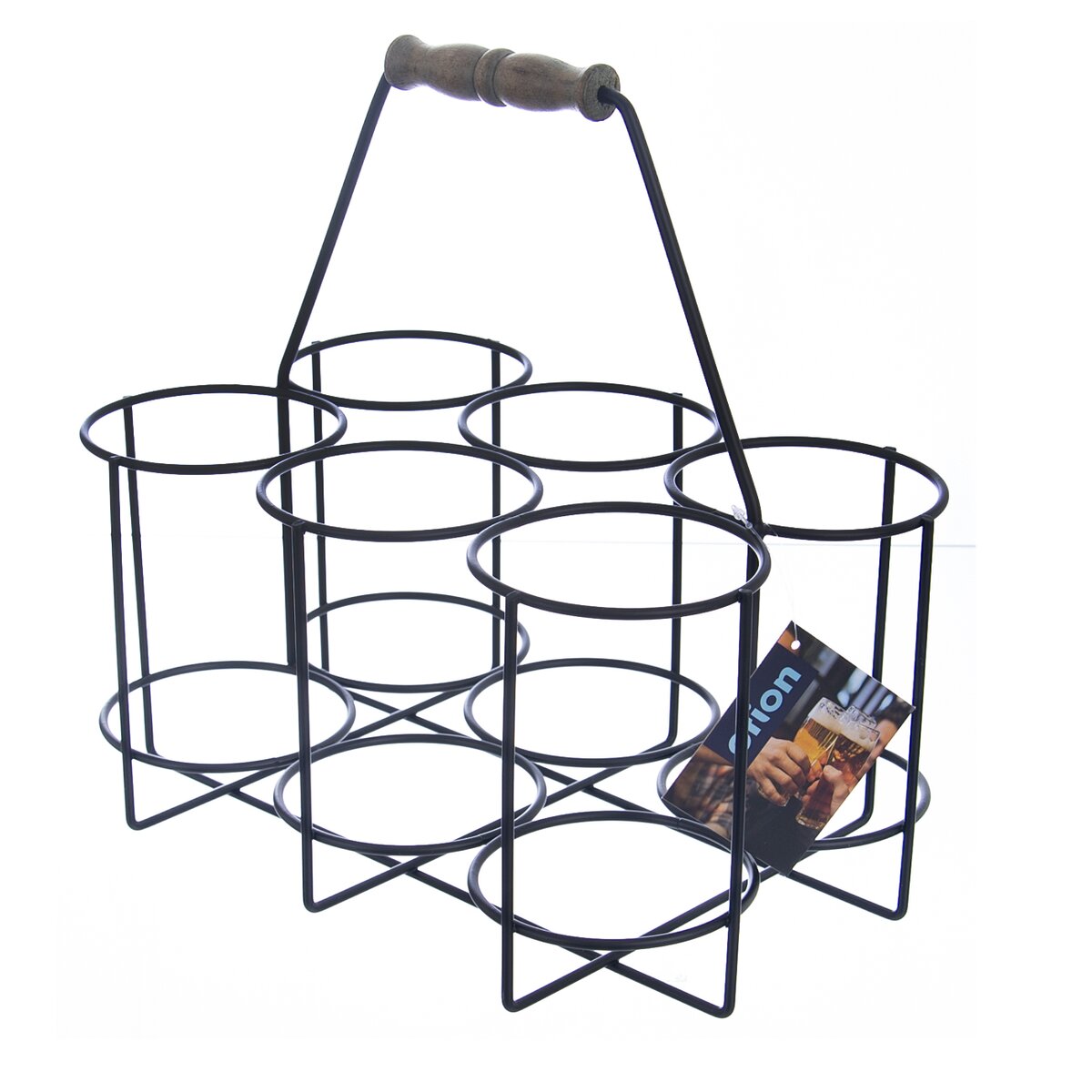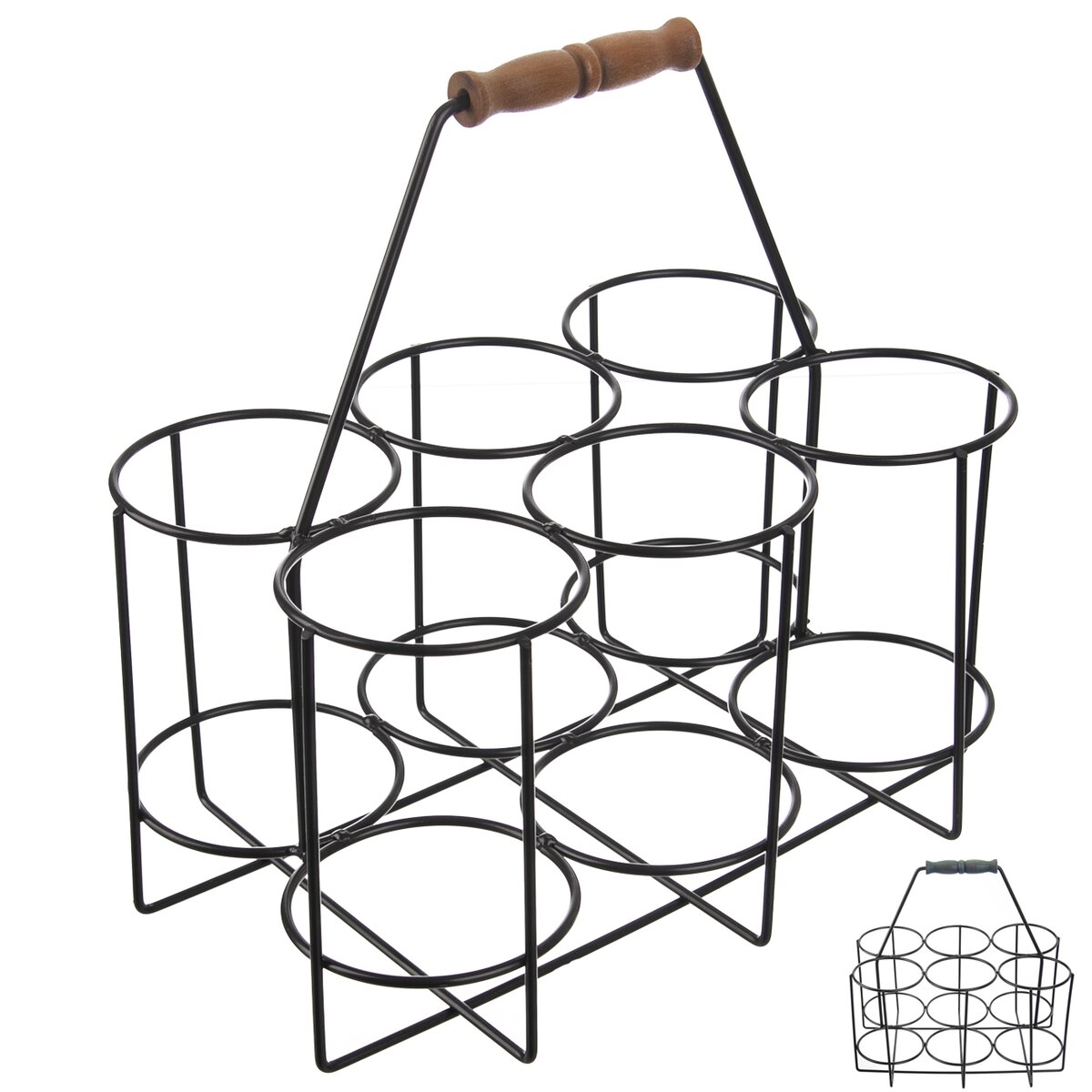 Kód produktu 540592Kovový stojan na 6 půllitrů nebo 6 nápojových lahví. Má praktické dřevěné ucho k jeho pohodlnému přenášení.