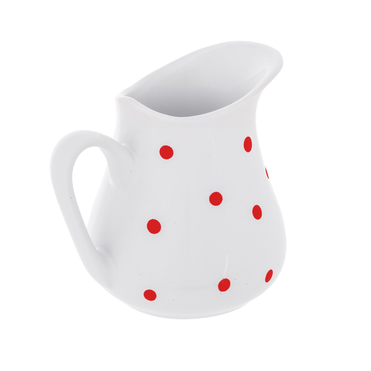 Kód produktu 126686Stylový keramický bílý džbánek s červenými puntíky na mléko, limonádu nebo jako originální váza.