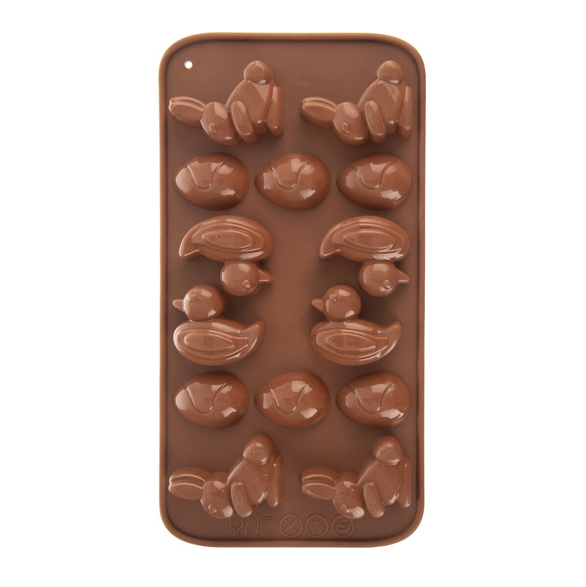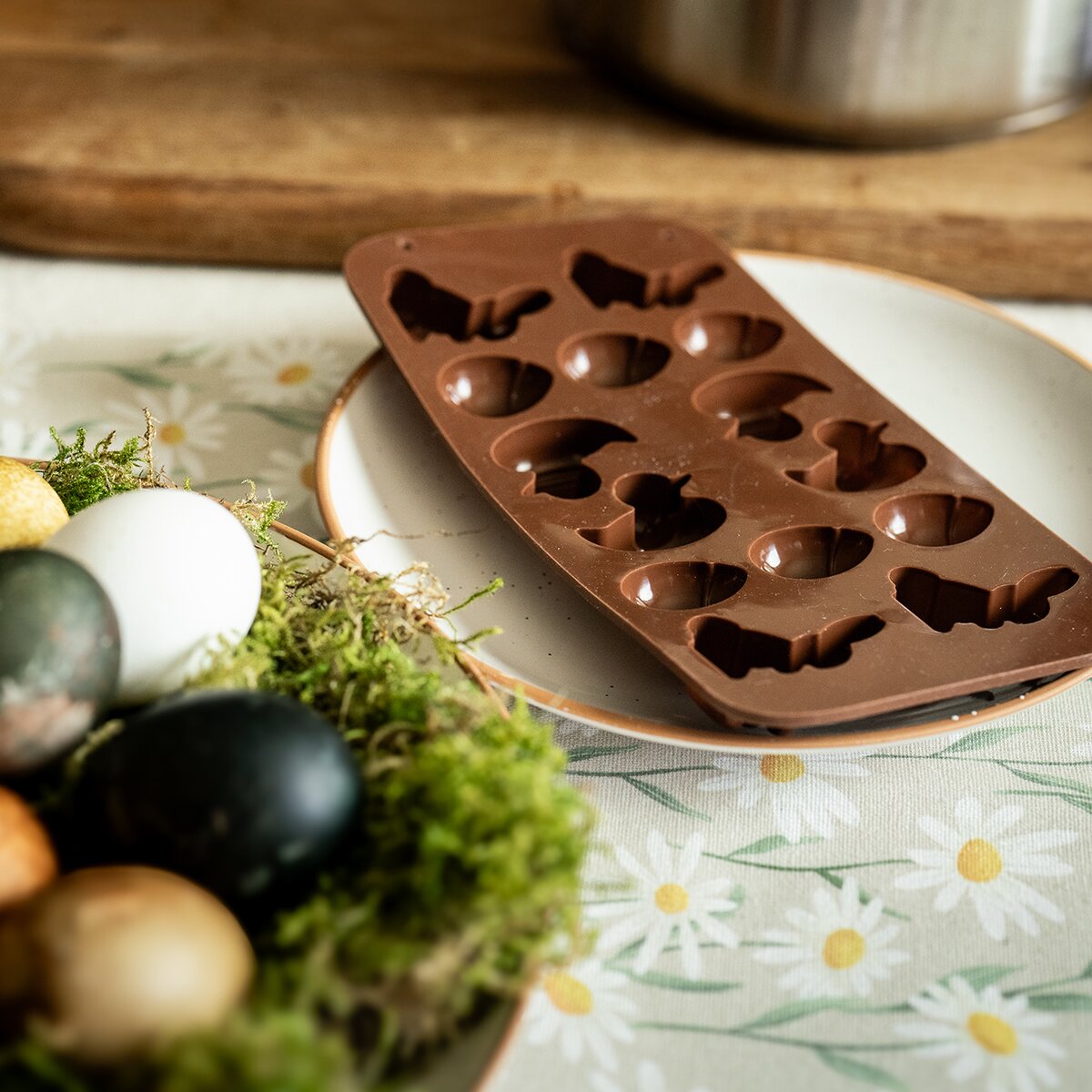 Stačí rozpuštěnou čokoládu nalít, přidat oblíbené ingredience, ořechy, sušené ovoce, sušenou levanduli apod. a nechat ztuhnout v ledničce. Jednotlivá vajíčka, zajíčky a kačenky z pružné formy jednoduše vyloupnete. Nebo ji použijte na pečení drobných máslových sušenek ke kávě pro vaši milovanou polovičku.