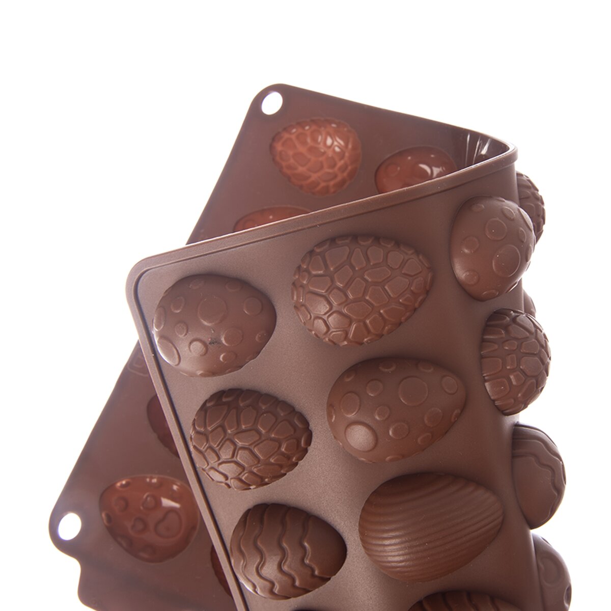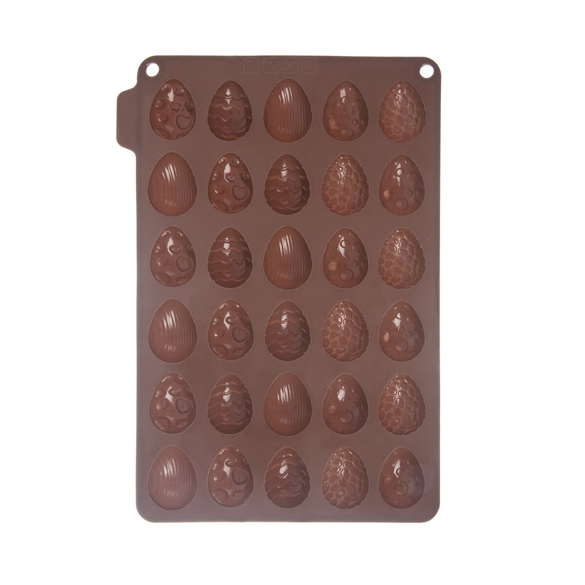 Kód produktu 154407Nepřilnavá hnědá silikonová forma je určena k výrobě originálních čokoládových pralinek ve tvaru velikonočních vajíček, lze v ní upéct také drobné sušenky ke kávě.