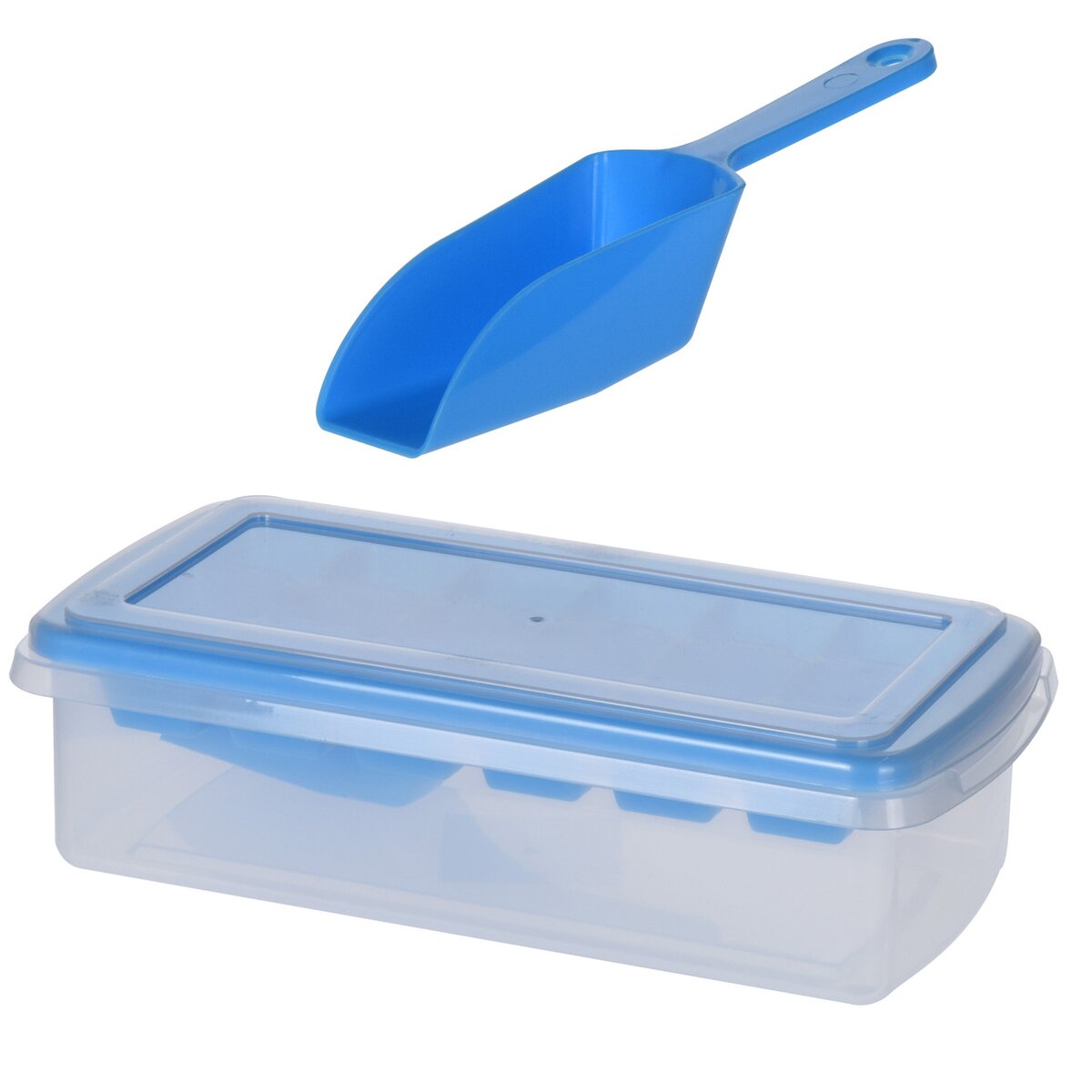 Kód produktu 151125Praktická plastová dóza s uvnitř vloženou formou na výrobu ledových kostek, které po zmražení lze vyklopit do spodní části. V balení je i praktická lopatka.