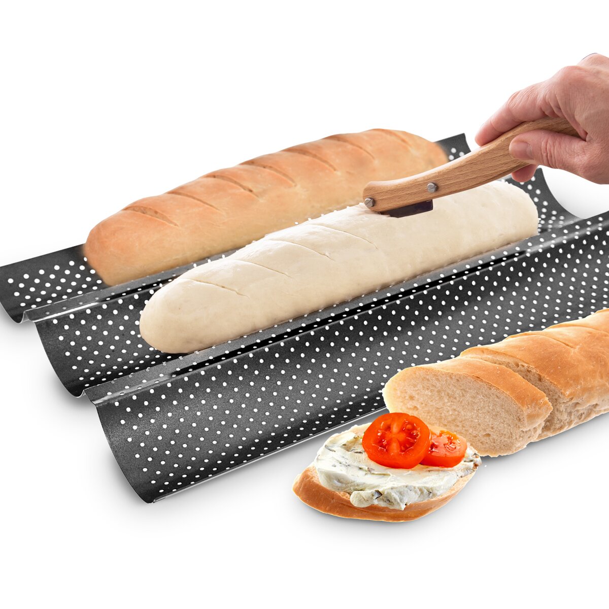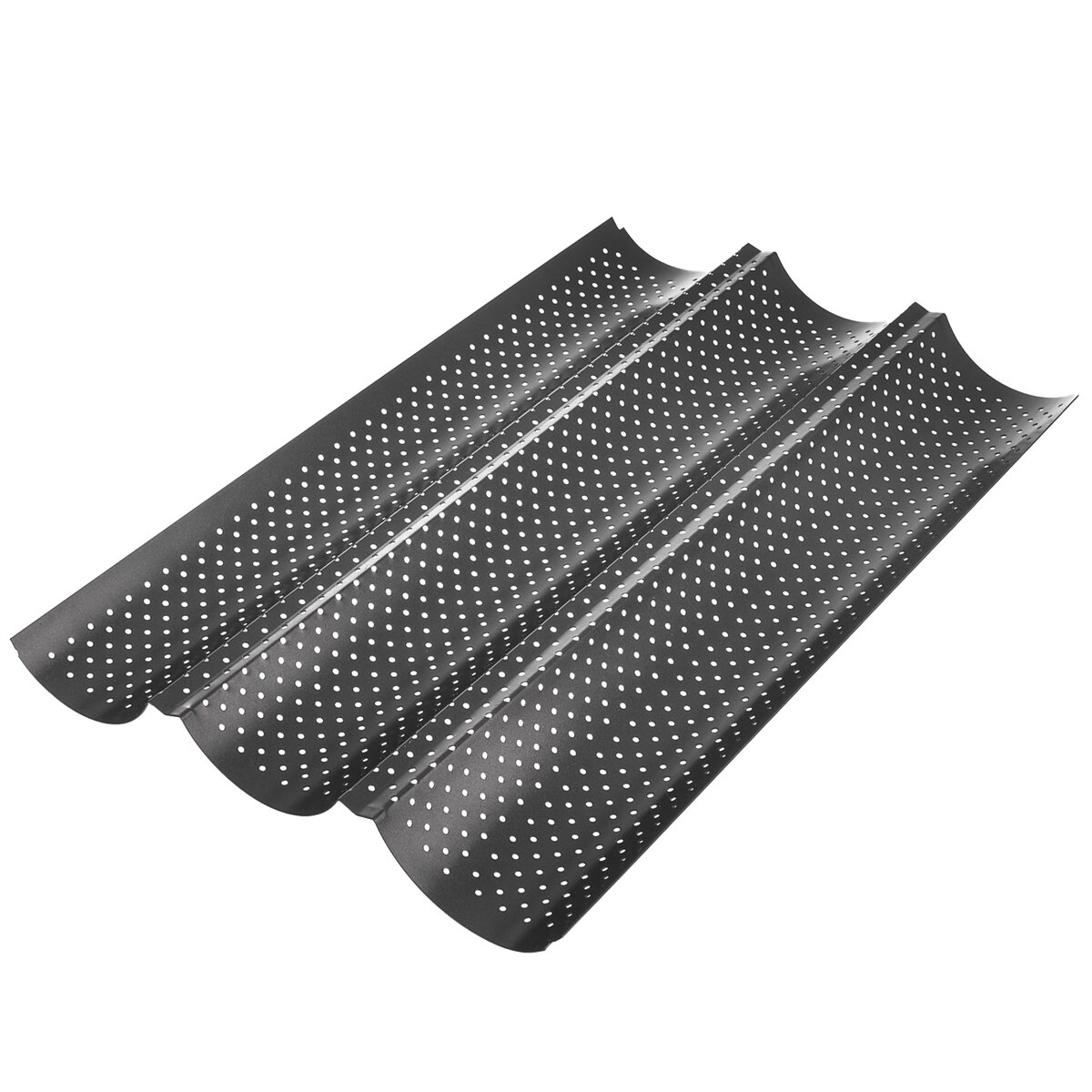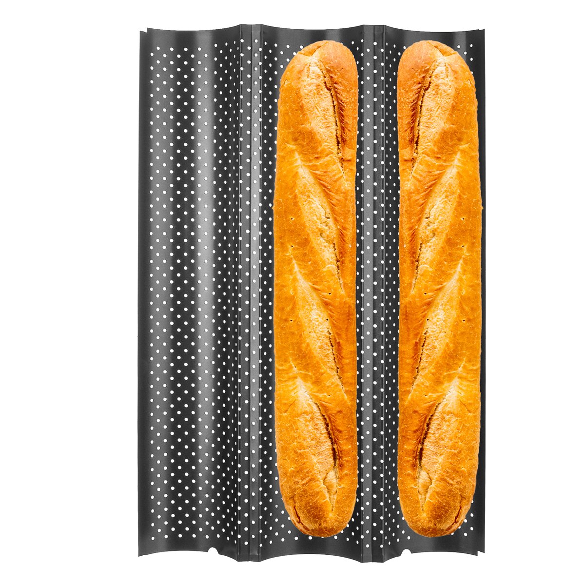 Trojitá forma s perforovaným povrchem je opatřena nepřilnavým povrchem, na který bagetky položite a pak šup s ním do rozpálené trouby.