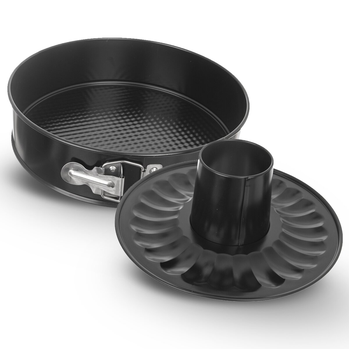 Kód produktu 123213Kulatá nepřilnavá dortová forma o průměru 24 cm, se dvěma výměnnými dny na pečení korpusu nebo bábovky. Je opatřená přezkou pro snadnější vyjímání upečených dobrot.