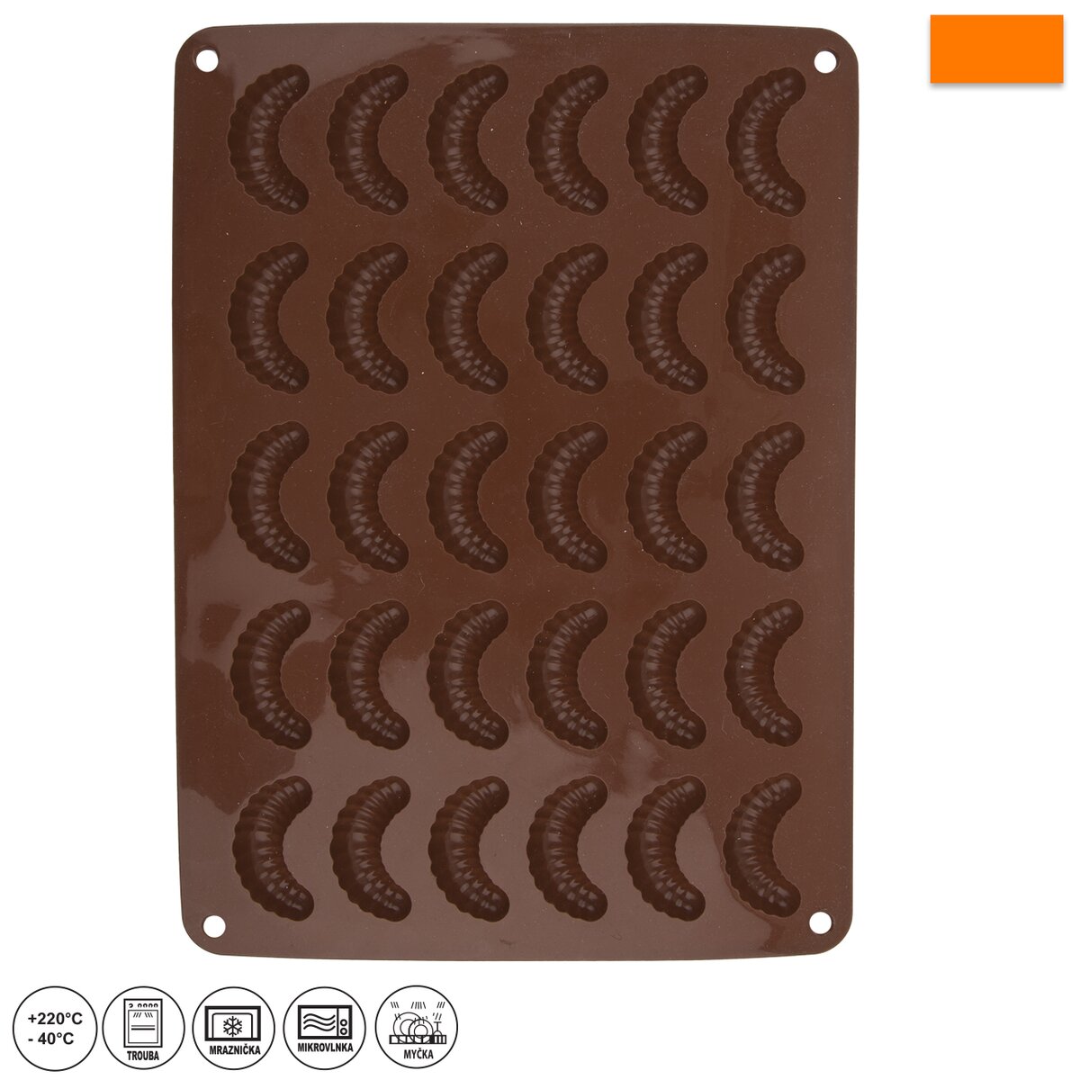 Kód produktu 120054Nepřilnavá silikonová forma umožní naráz upéct 30 ks vanilkových, čokoládových nebo ořechových rohlíčků, ale poradí si i s čokoládovými pralinkami.