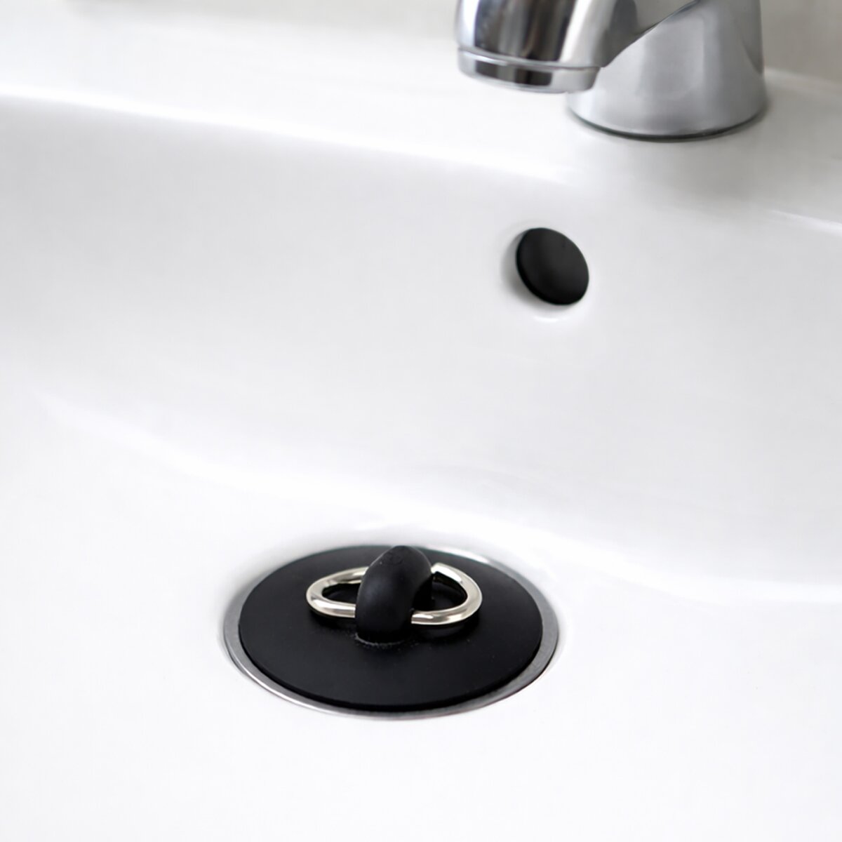 Kód produktu 144522Gumová zátka do umyvadla o průměrech 4,6 / 4,3 cm ve tvaru komolého kužele s kovovým očkem.