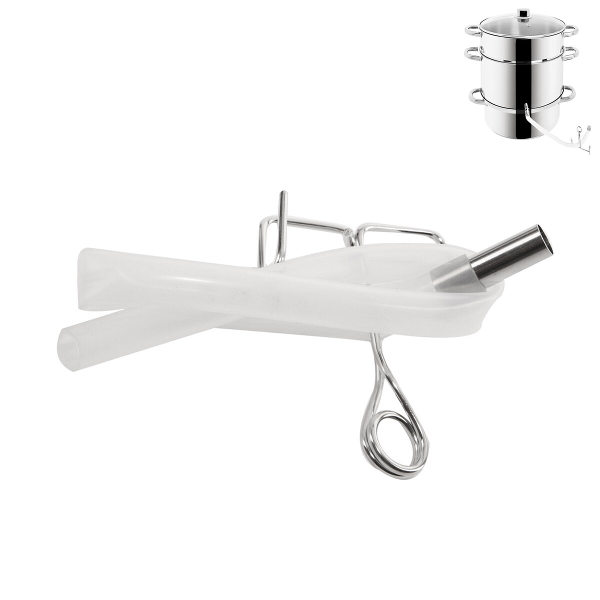 Náhradní vypouštěcí hadička s uzávěrem k nerezovému odšťavňovacímu hrnci, vyrobená ze silikonu a opatřená nerezovou koncovkou a sponou, která zajistí uzavření trubice.