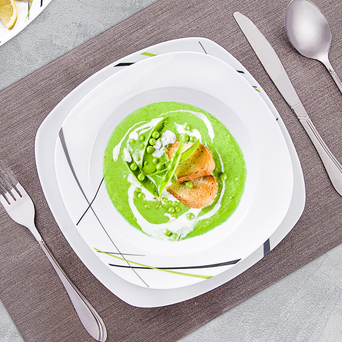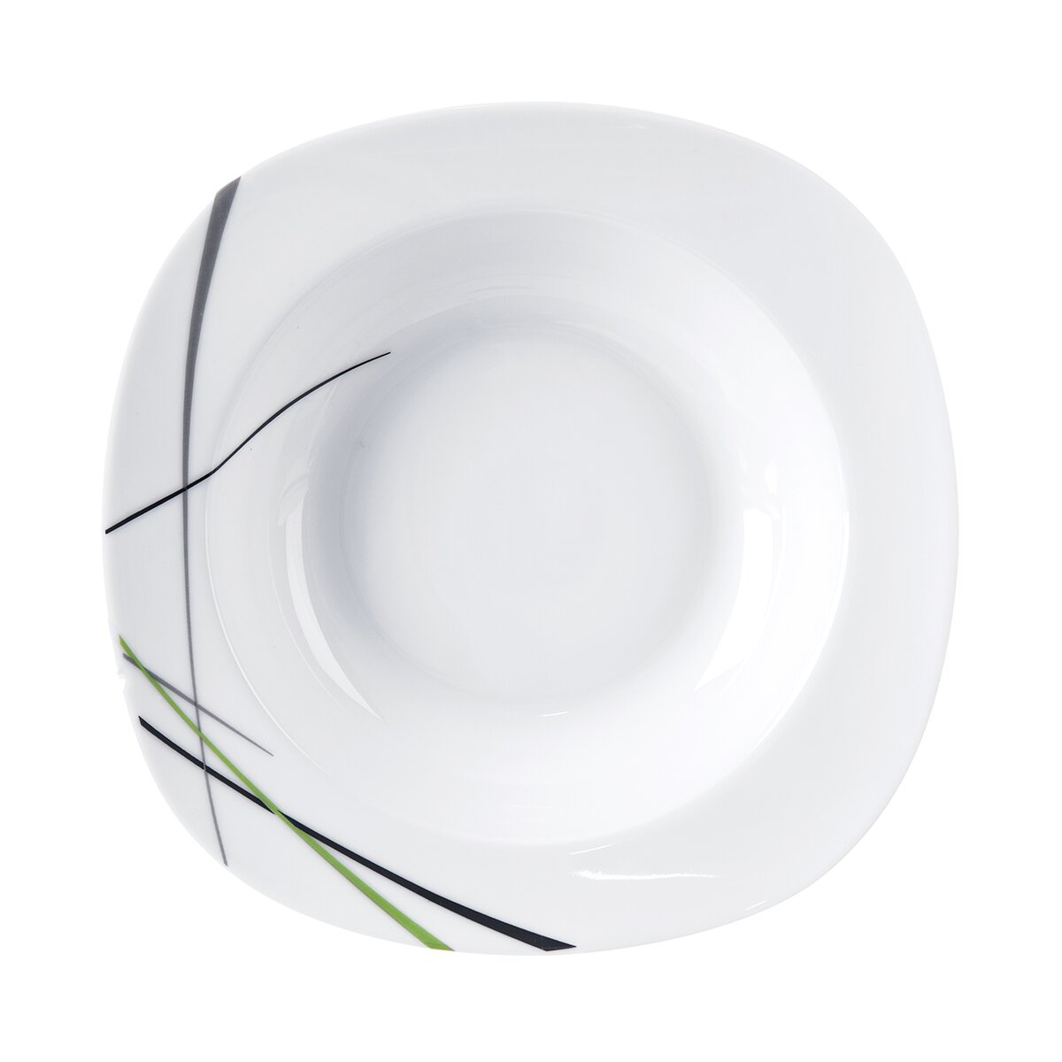 Hluboký talíř hranatého tvaru na polévky, saláty či těstoviny. Má rozměry 21×21 cm a je vyrobený z kvalitního porcelánu. Kraj talíře zdobí černo-zelený dekor v podobě několika jemných linií.