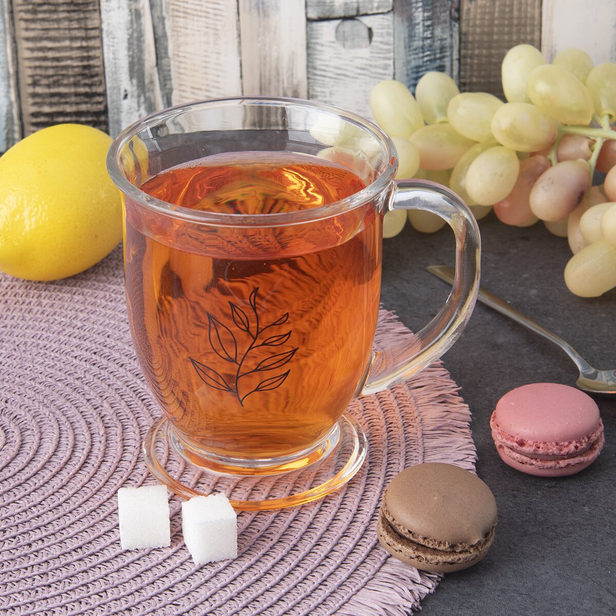 Na čaj či horkou čokoládu, ale také ice tea nebo ledové frappé se hodí skleněný hrnek. Je zdoben jemným dekorem čajových lístků, který vznikl v dílně našich designérů.