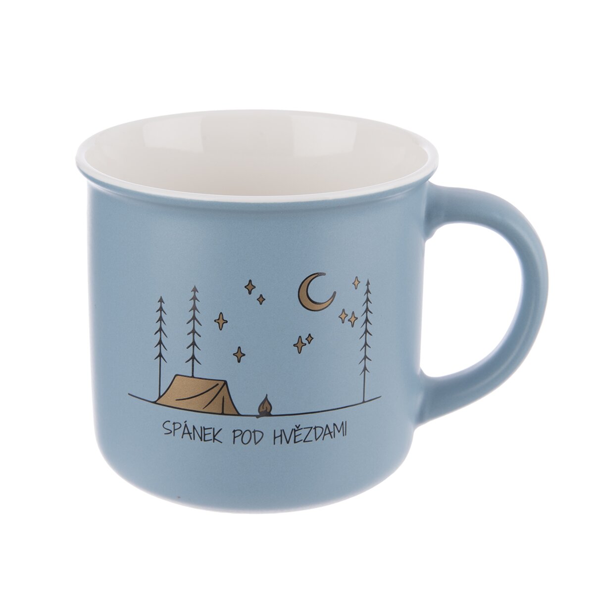 Proto se všem "dobrodruhům" bude hodit stylový hrnek Cestování, ať už na horký čaj nebo velkou kávu s mlékem. Tento modrý krasavec má objem 0,4 l a lze ho použít k podávání teplých nápojů, polévky do hrnečku nebo k ohřevu v mikrovlnné troubě. Zdobí jej tematický dekor a nápis SPÁNEK POD HVĚZDAMI. Po použití jej lze mýt v myčce.