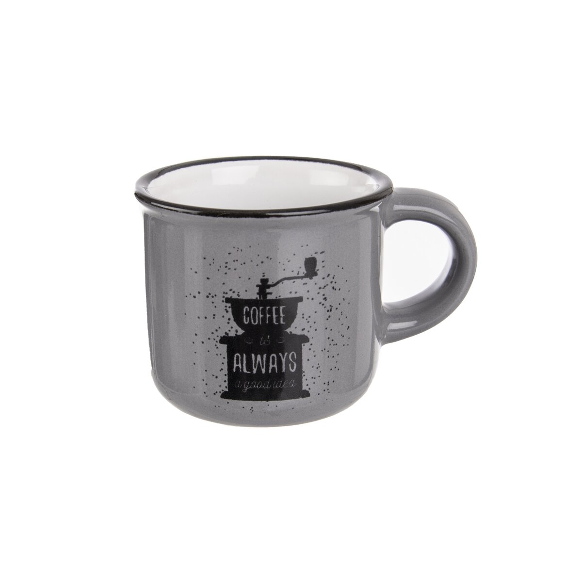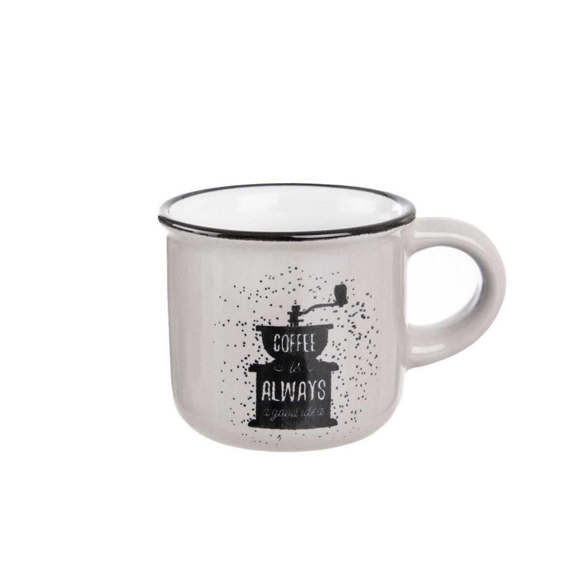 Espresso, lungo nebo doppio. Ať už upřednostňujete jakýkoliv typ kávy, vychutnejte si ji v tomto stylovém keramickém hrnku o objemu 90 ml. Zdobí jej motiv kávového mlýnku a černá linka při okraji hrnku.