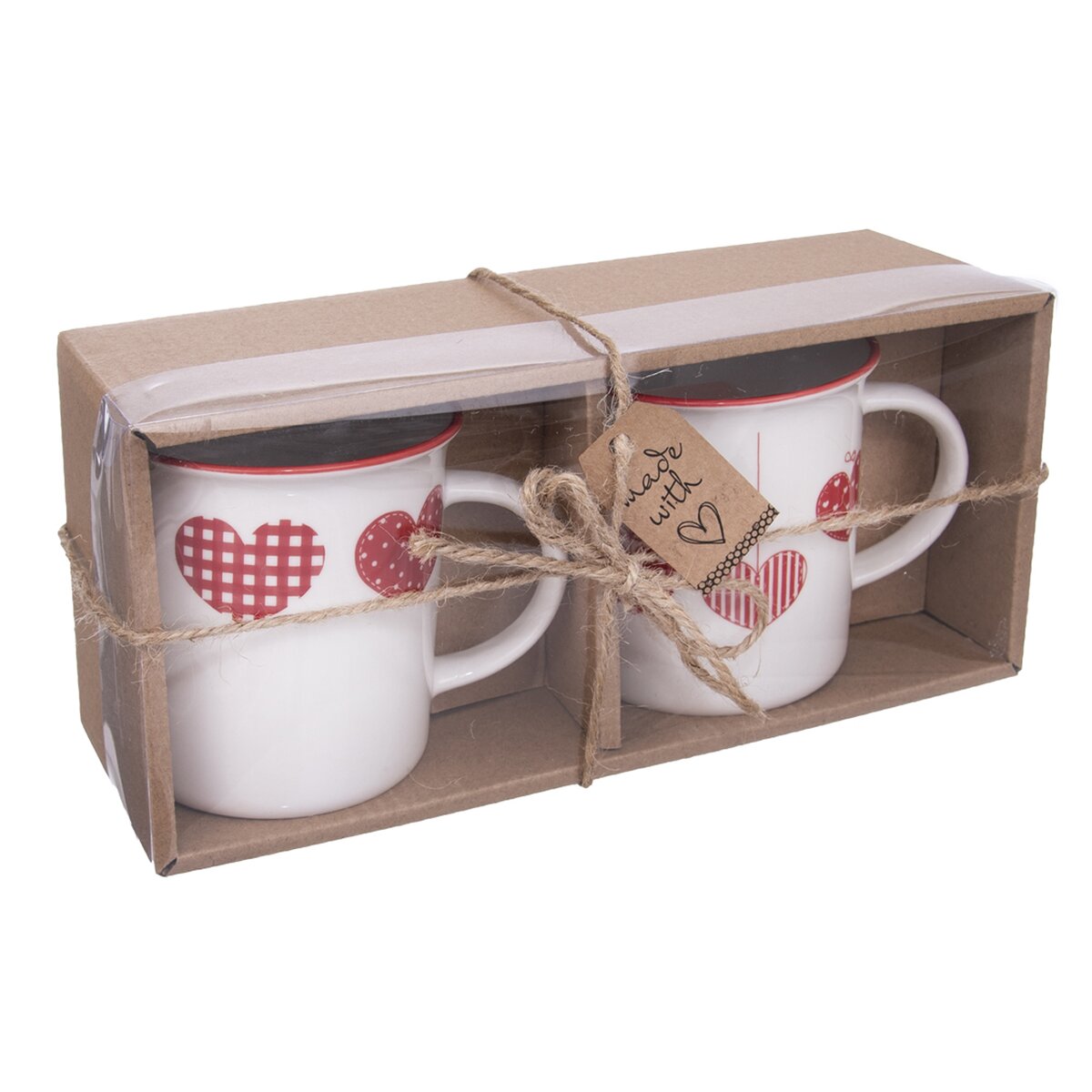Kód produktu 127243Set dvou kusů bílých porcelánových hrnků o objemu 0,35 l s a červeně lemovaným okrajem a motivy srdcí.