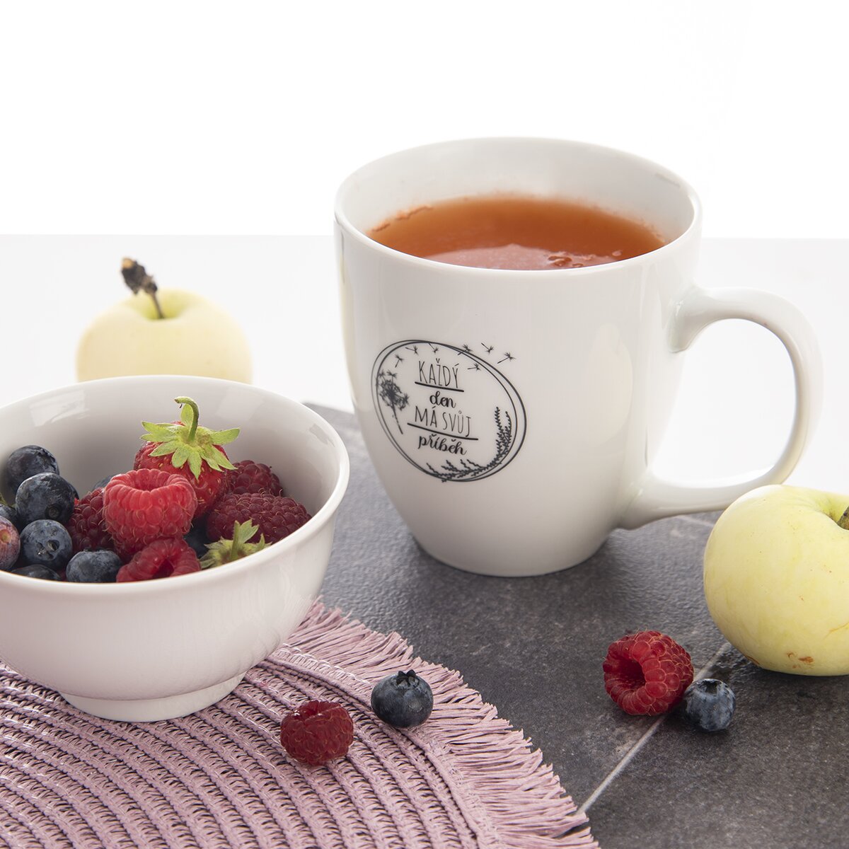 Kód produktu 128890Bílý porcelánový hrnek o objemu 470 ml, s originálním nápisem KAŽDÝ DEN MÁ SVŮJ PŘÍBĚH.