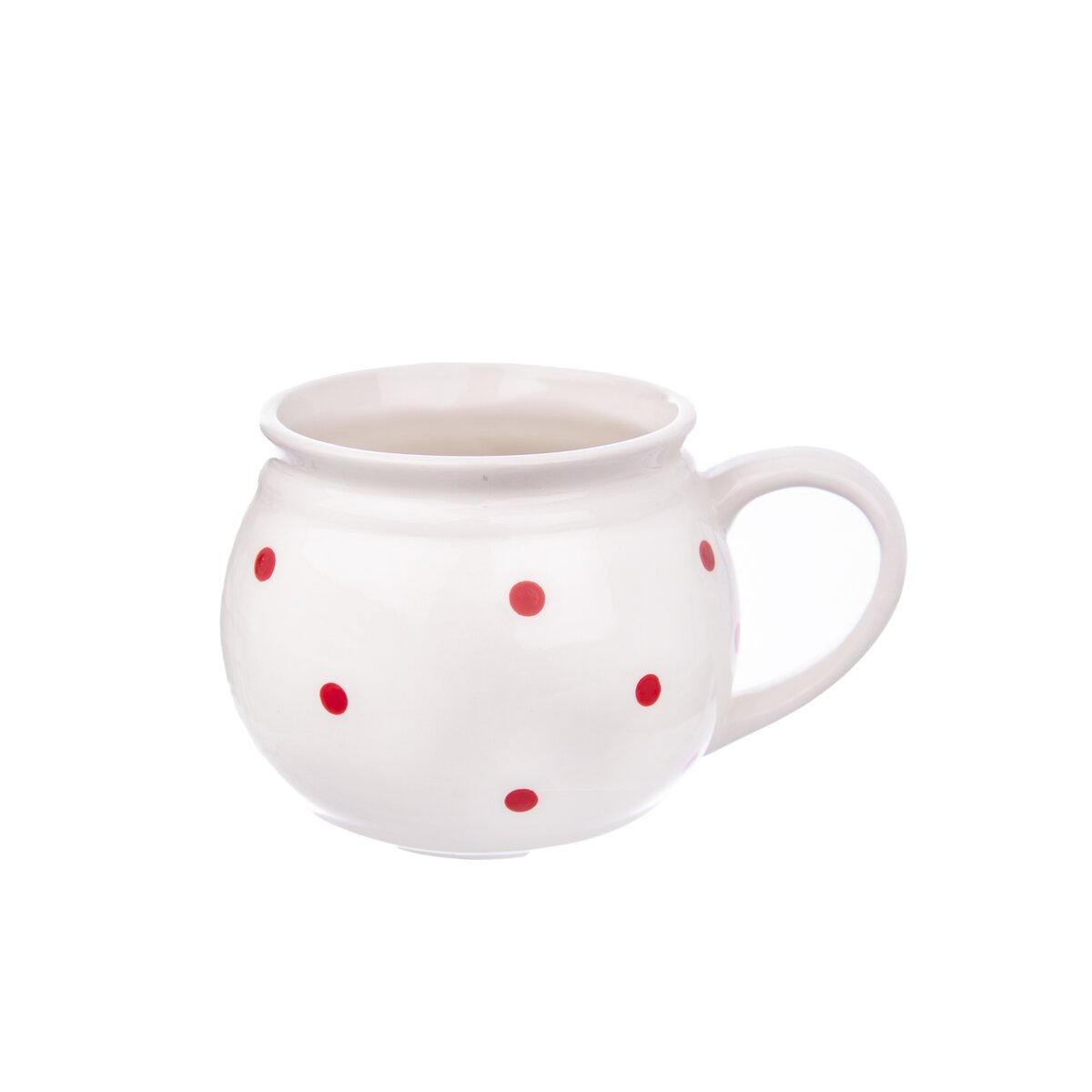 Roztomilý retro bucláček s červenými puntíky. To je keramický hrnek KRAJÁČ o objemu 200 ml, který se výborně hodí na kávu, čaj, ale i kakao nebo horkou čokoládu. Díky svému retro designu oživí design venkovské chalupy i moderní kuchyně.