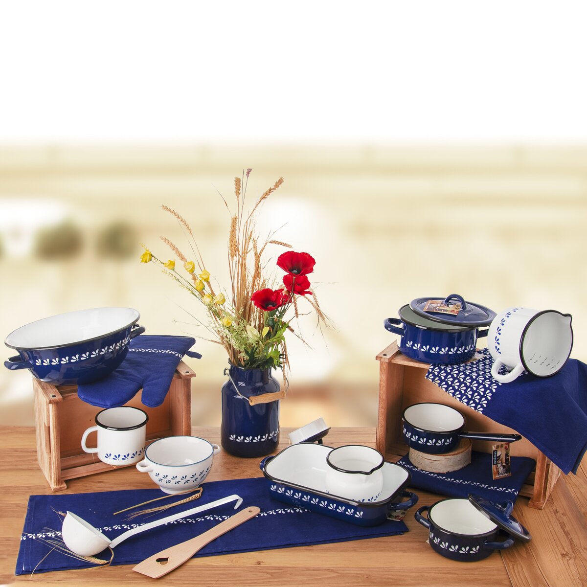 Kód produktu 113511Bílý smaltovaný hrnek o objemu 0,8 l s dekorem MODROBÍLÁ.