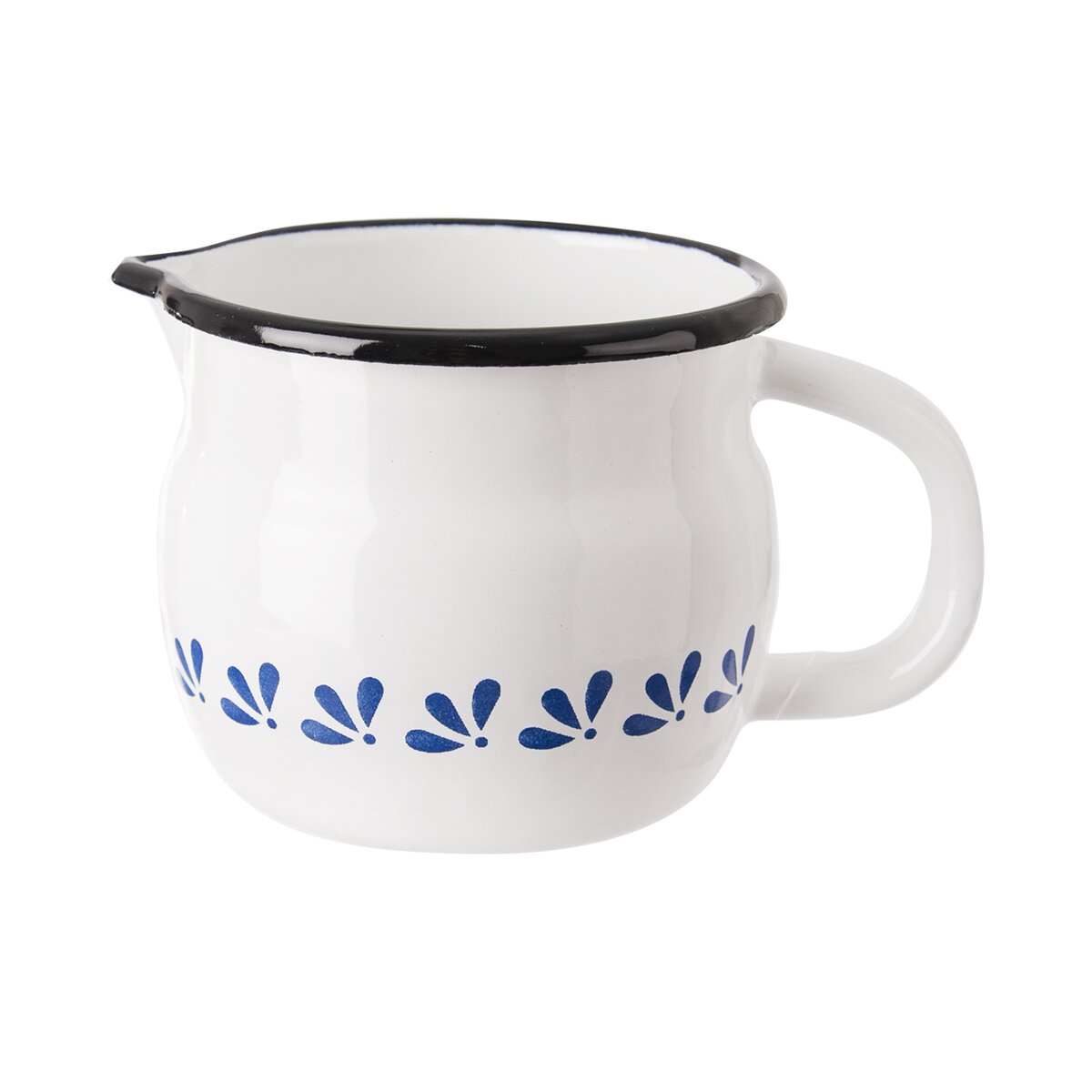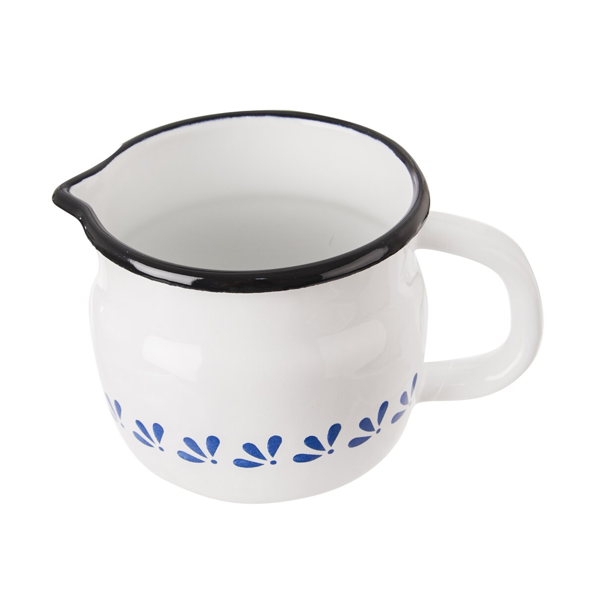 Kód produktu 113510Bílý smaltovaný hrnek o objemu 0,8 l s hubičkou a dekorem MODROBÍLÁ.