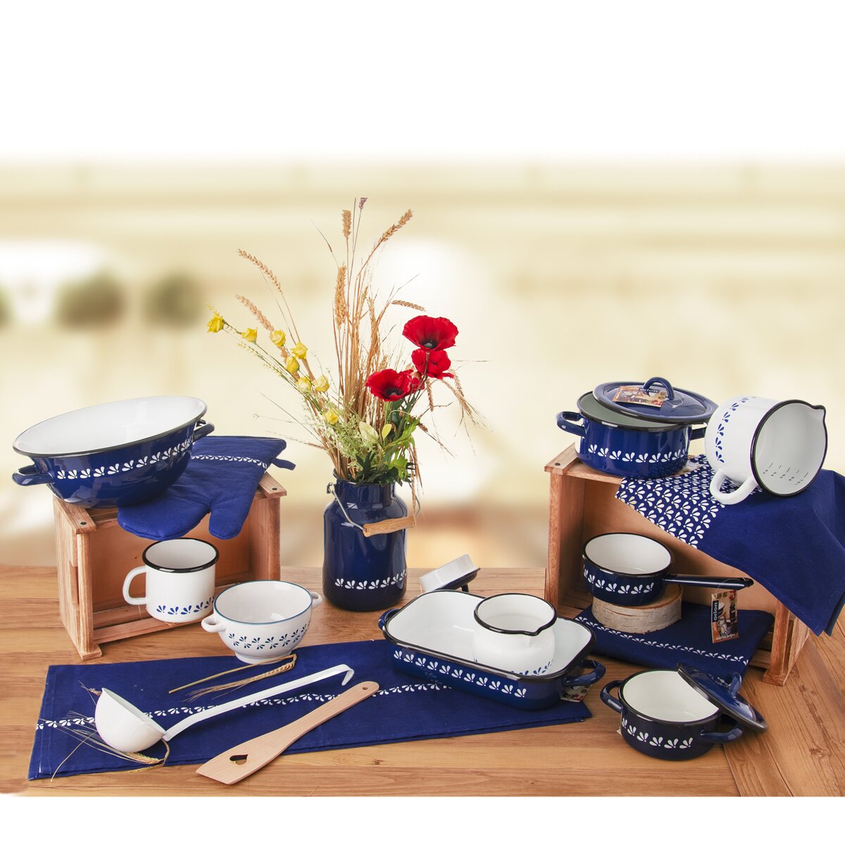 Oslava tradice a elegance. To představuje tento baňatý smaltovaný hrnek v bílé barvě. Zdobí jej modrá kvítka, která jsou inspirovaná modrotiskem, tradiční technikou potisku textilu.