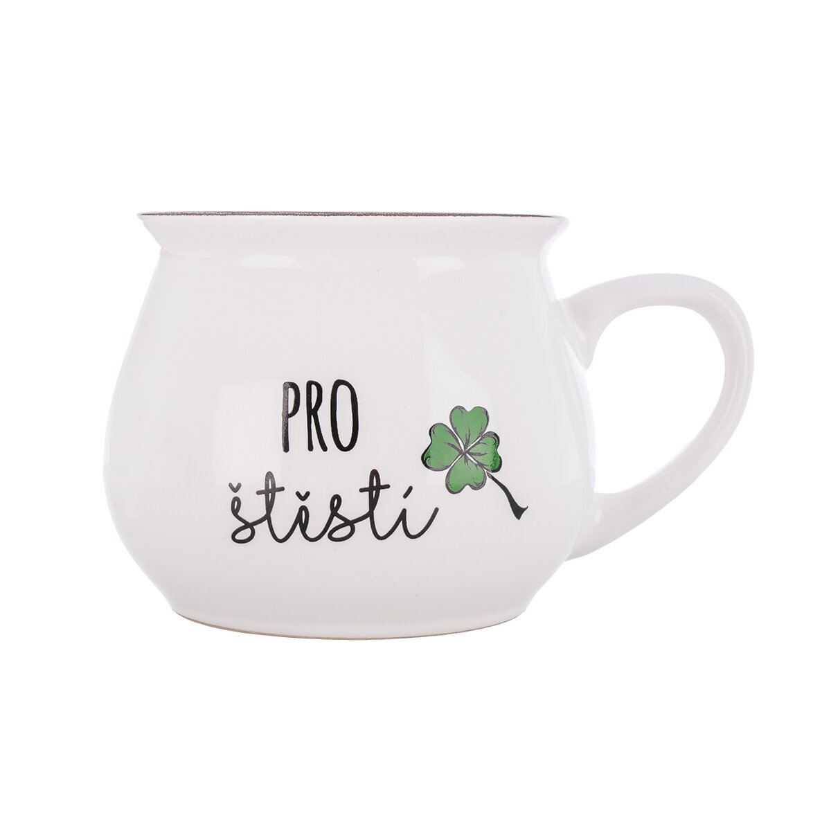 Kód produktu 132223Baculatý keramický hrnek o objemu 300 ml zdobí nápis "Pro štěstí" a je určen k podávání teplých i studených nápojů.