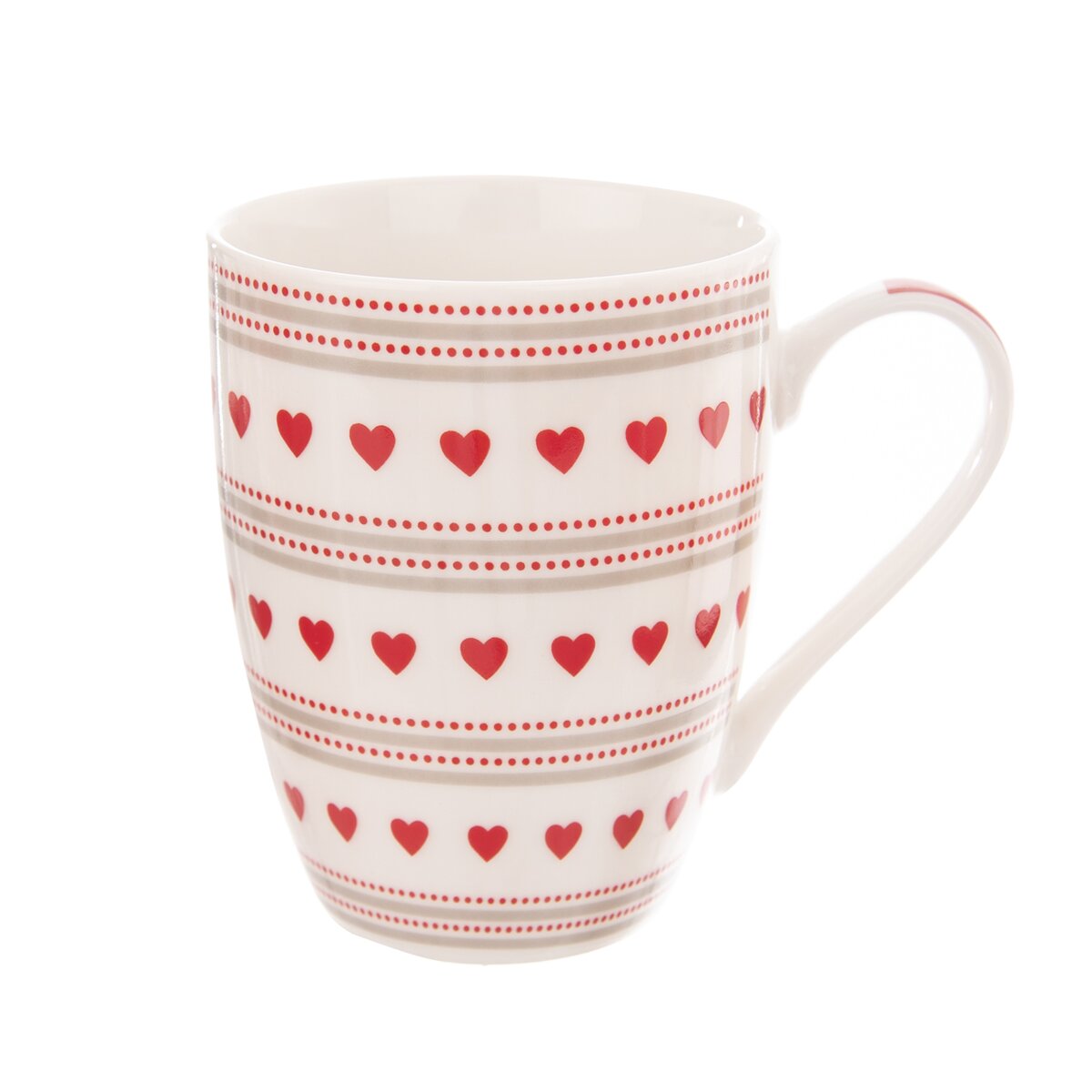 Kód produktu 128804Červený porcelánový hrnek o objemu 0,35 l s dekorem bílých proužků a srdíček.