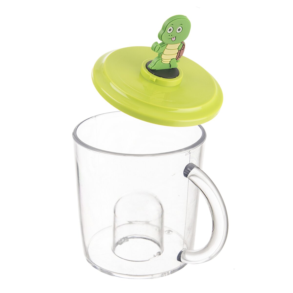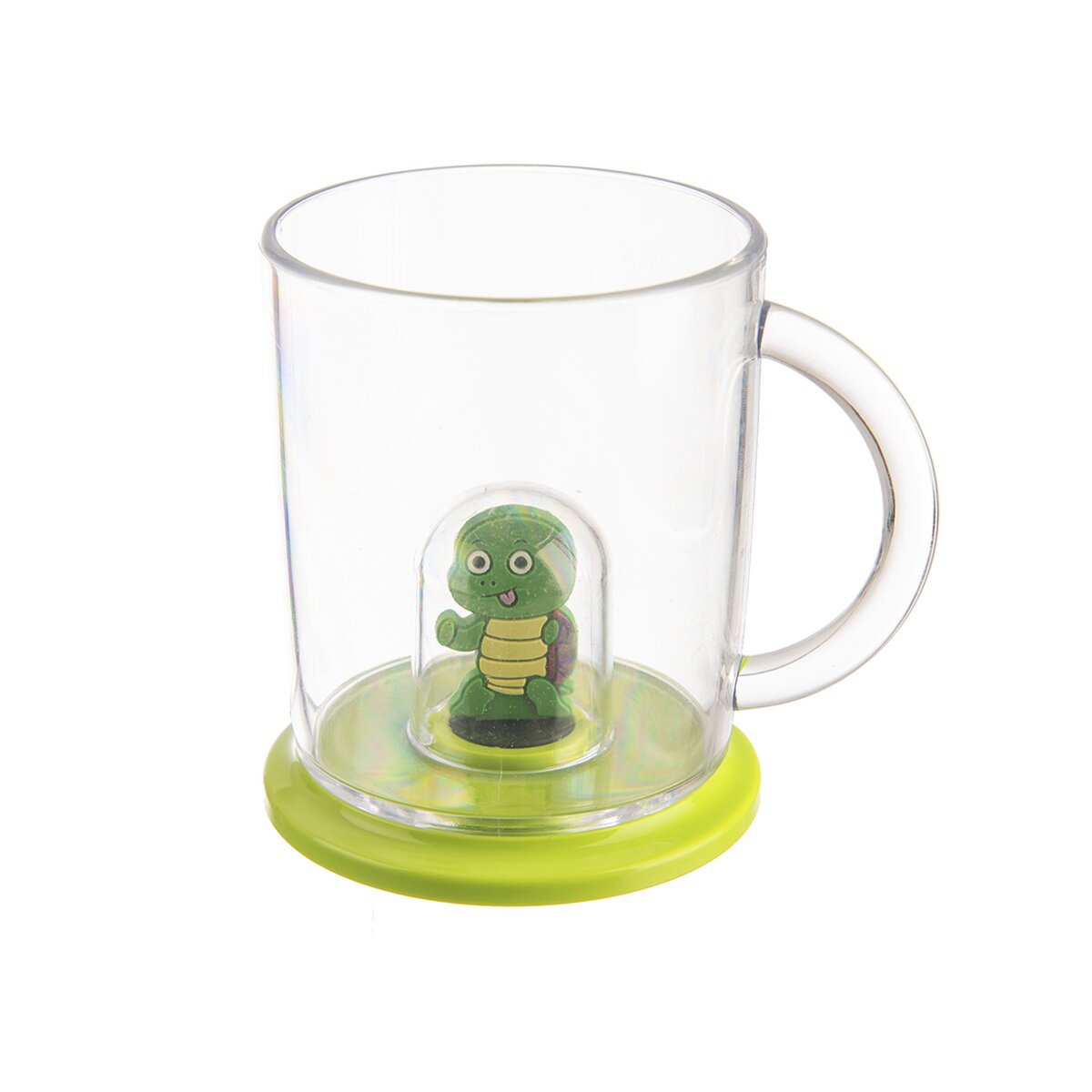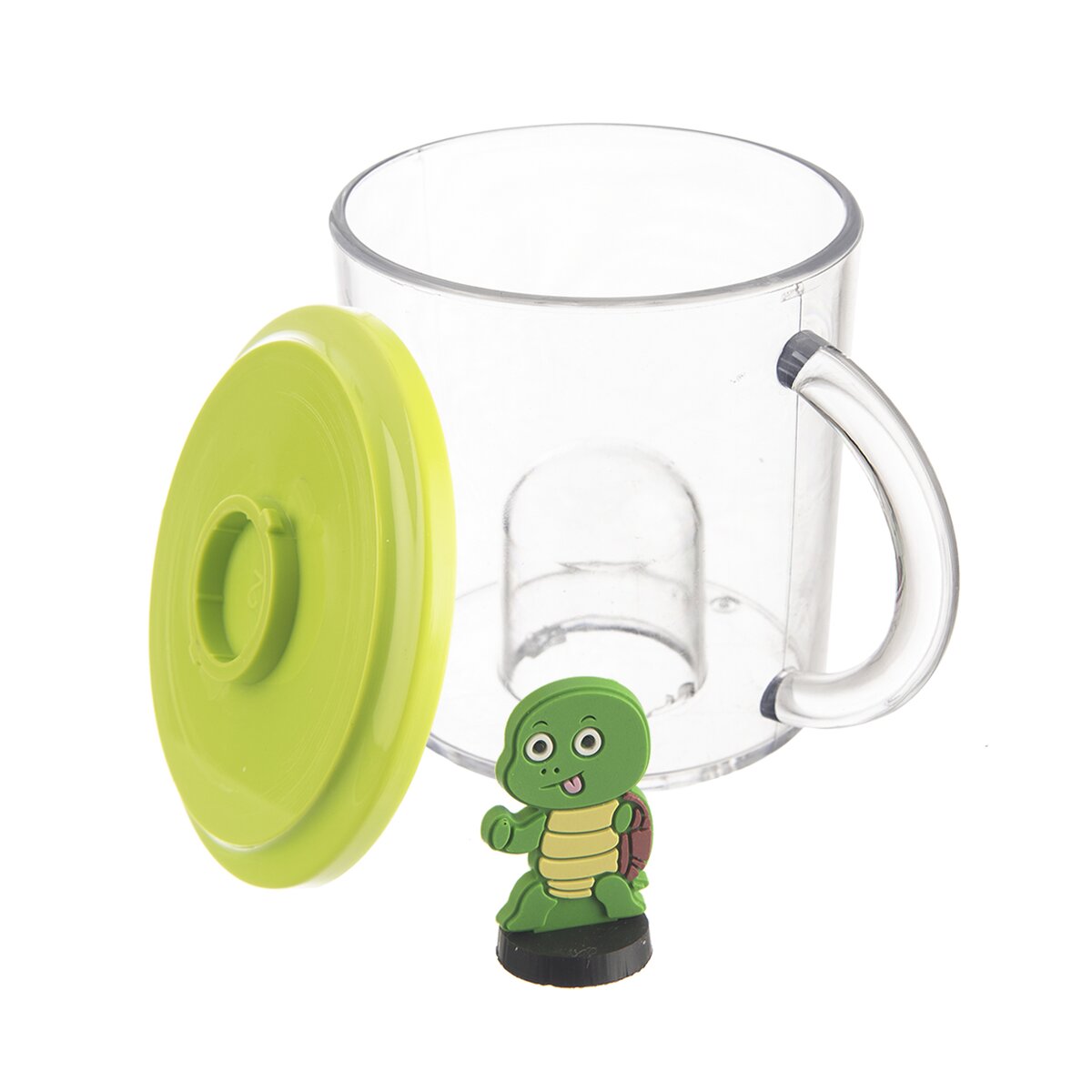 Kód produktu 129458Transparentní hrnek s figurkou želvy má objem 270 ml a je vyroben z tritanu. Zelené víčko slouží k uzavření hrnku i jako pevný podtácek.