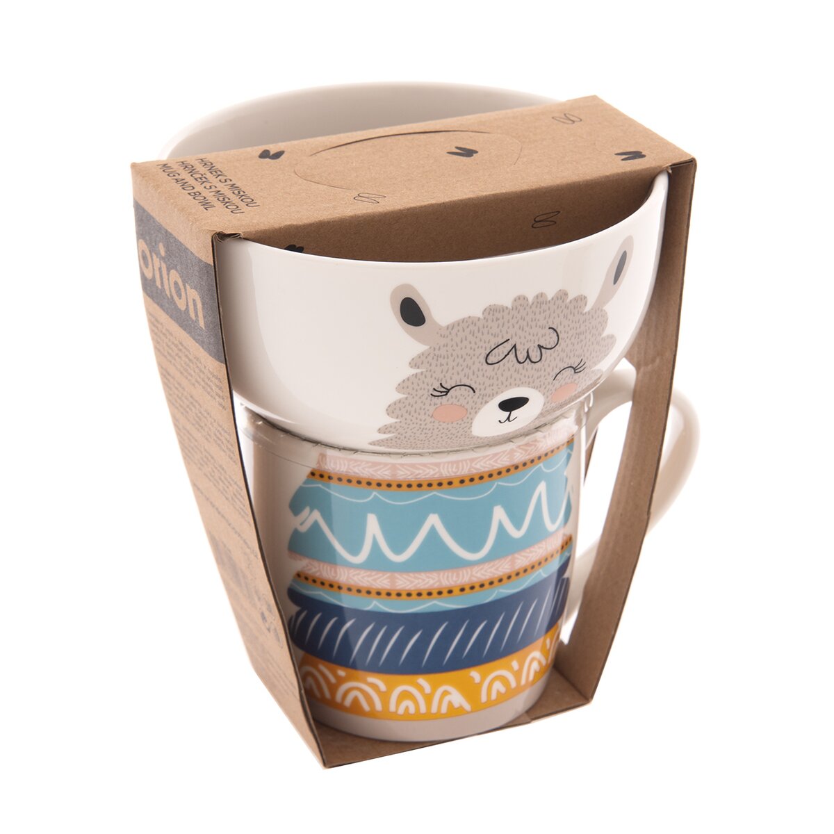 Kód produktu 129644Porcelánový hrnek LAMA o objemu 0,35 l je doplněn miskou o objemu 0,6 l. Roztomilý dekor na sebe plynule navazuje.