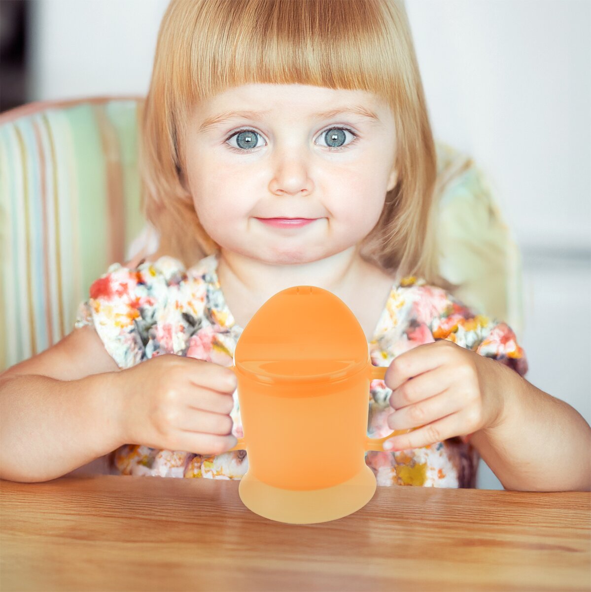 Oranžový plastový hrnek s pítkem o objemu 230 ml neobsahuje BPA, mohou ho tak používat děti od 3 let, senioři a osoby s horší jemnou motorikou. Má praktické pítko s otvory a po jeho sejmutí jej lze snadno umývat i v myčce.