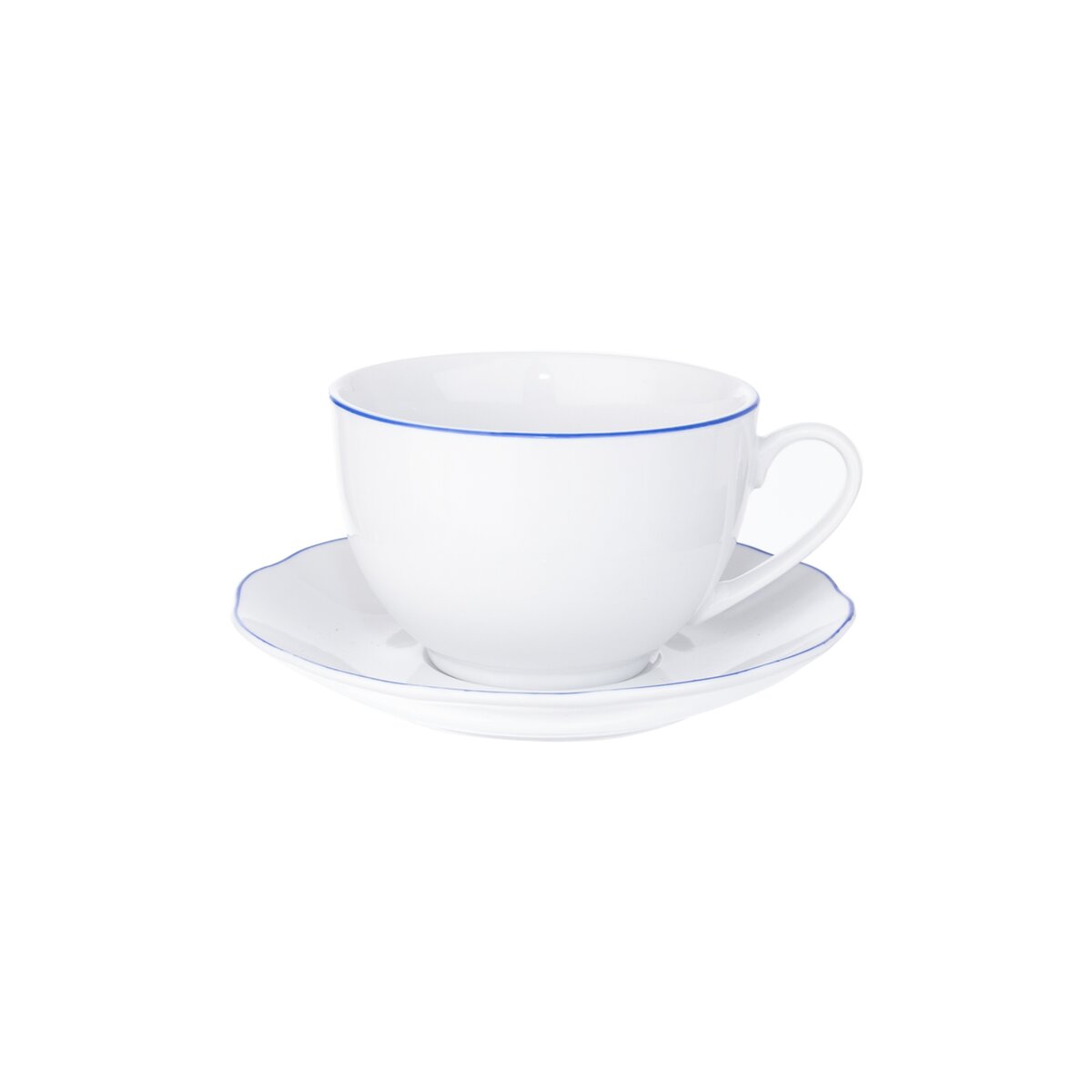 Kód produktu 127222Hrnek s podšálkem s modrou linkou. Materiál: porcelán. Rozměry: 0,28 l, pr. 9 cm, v. 6 cm, podšálek pr. 14 cm.