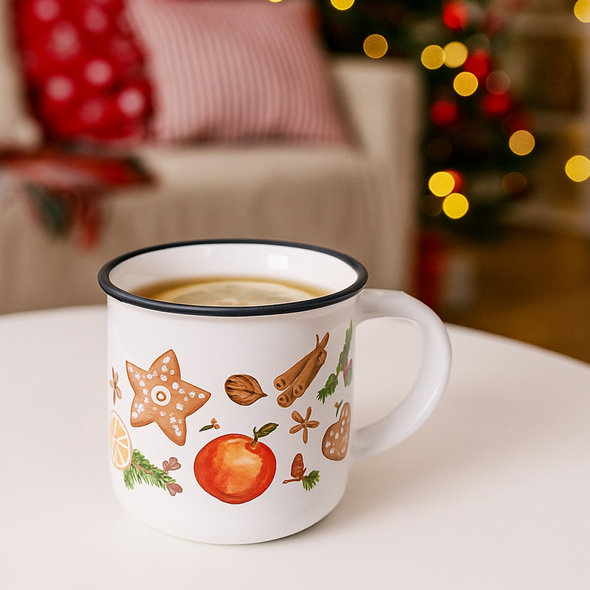 Hrnek nemusí sloužit jen na nápoje – zkuste ho využít i jako vánoční dekoraci! Naplňte ho perníčky, cukrovím nebo skořicí a postavte na stůl jako součást vánočního stolování. Může být také součástí dárkové sady s čajem nebo domácím sušeným ovocem.