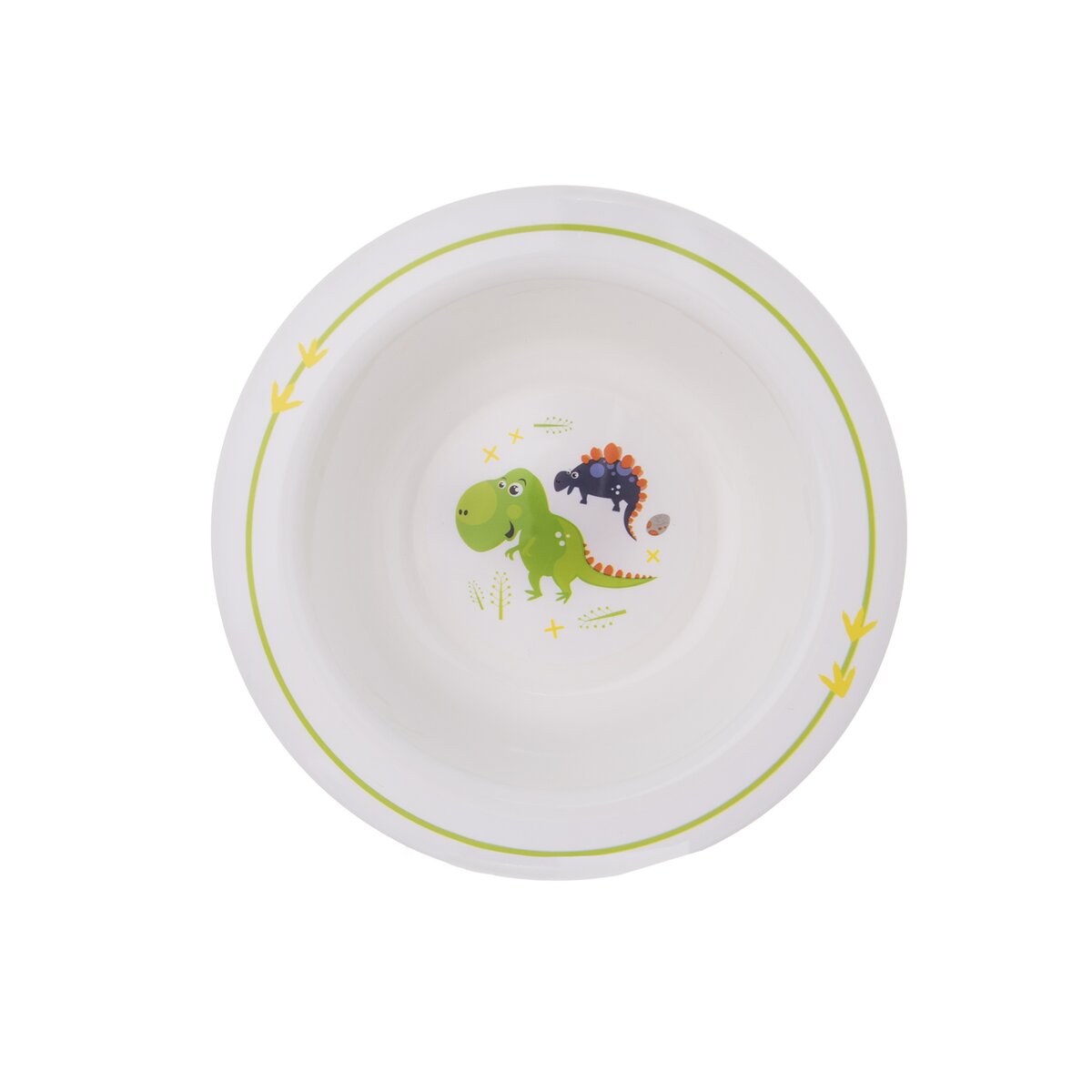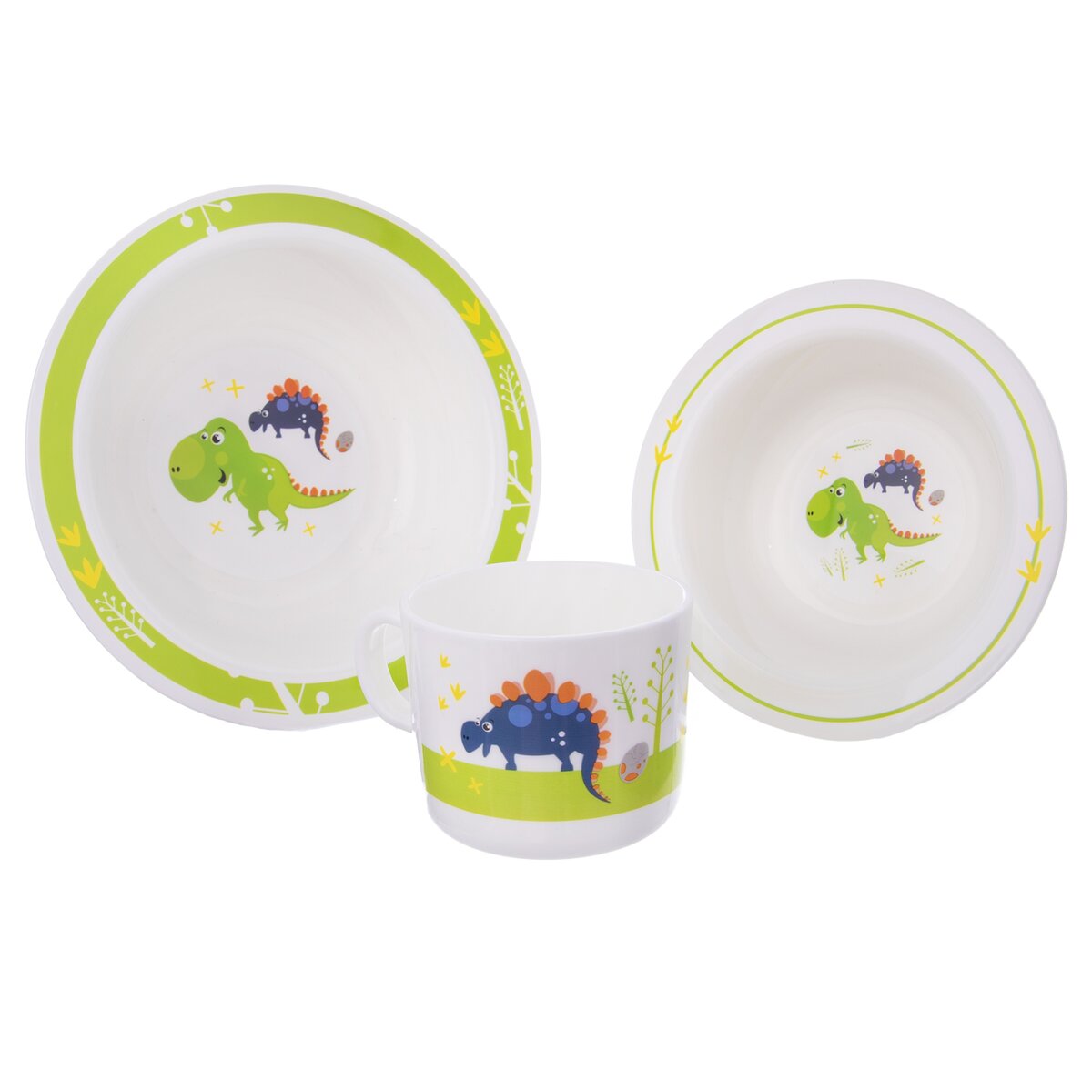 Kód produktu 112349Plastová jídelní sada DINO tvořená hrnkem o objemu 0,25 l, talířem a dvěma hlubokými miskami o průměru 14 cm a 17,5 cm.