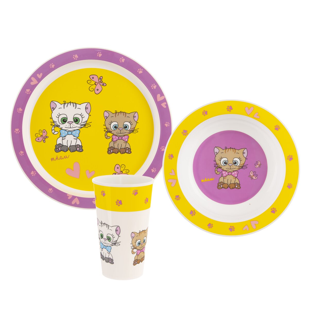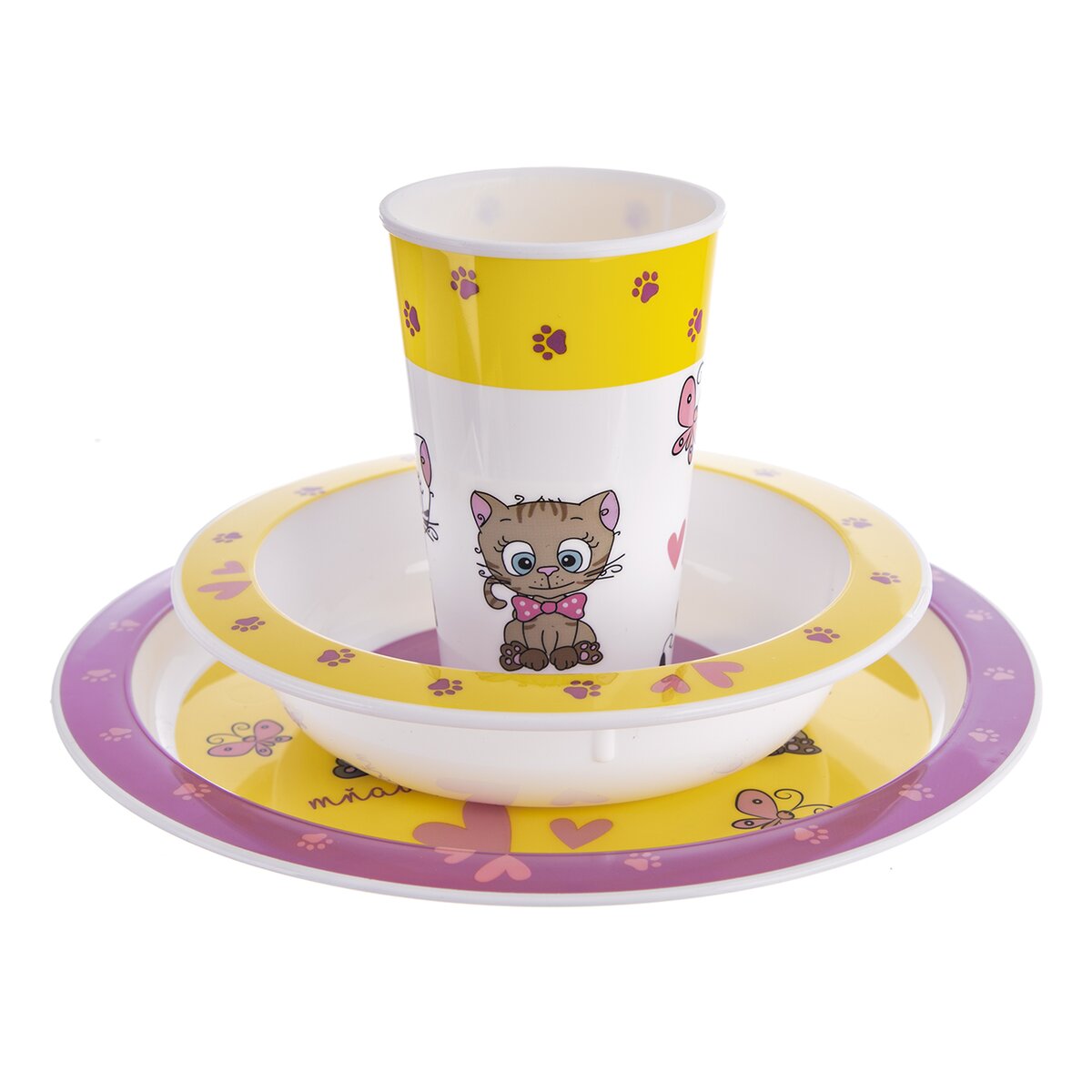 Kód produktu 112369Plastová jídelní sada KOCOUŘI obsahuje pohár o objemu 280 ml, talíř průměru 21,5 cm a misku průměru 16 cm.