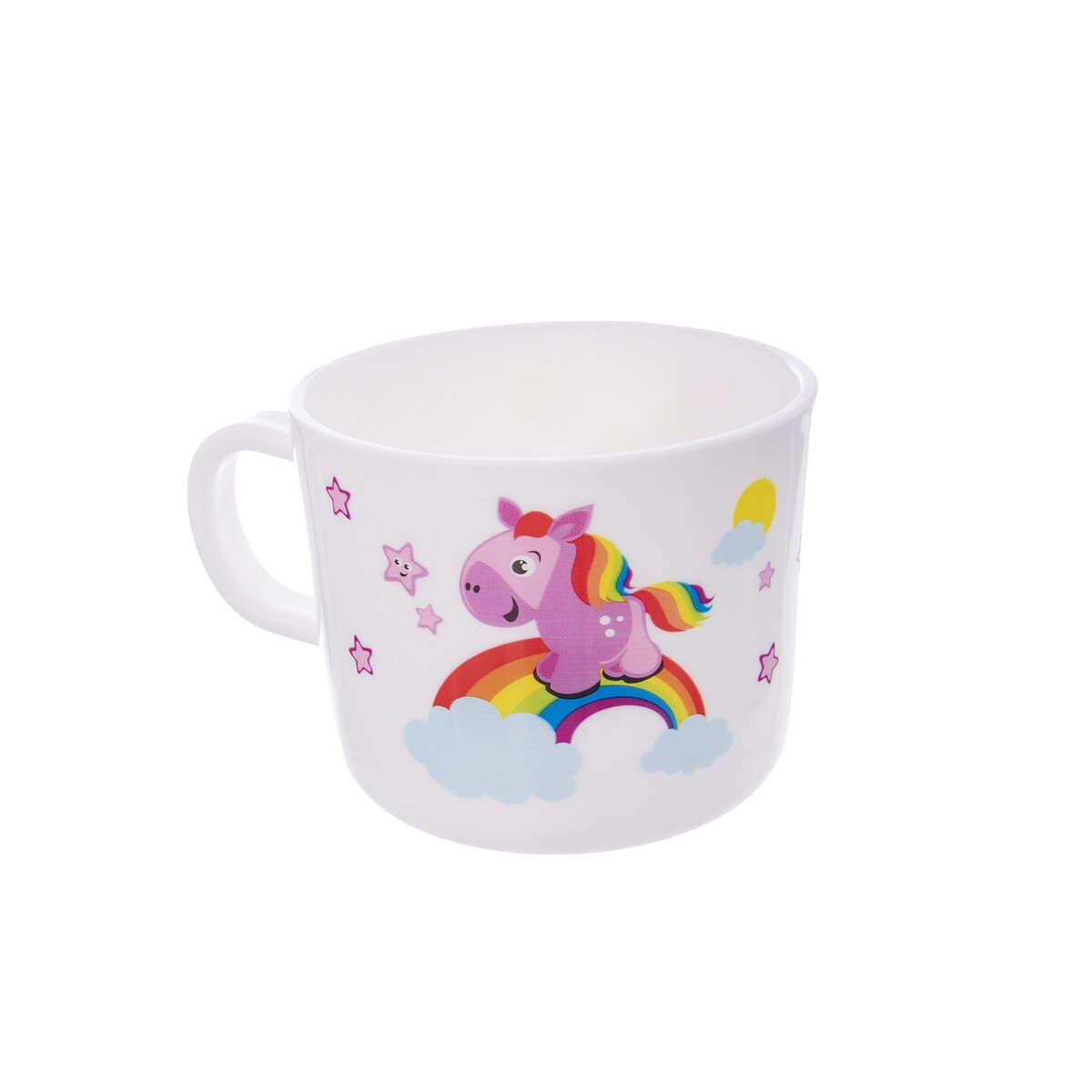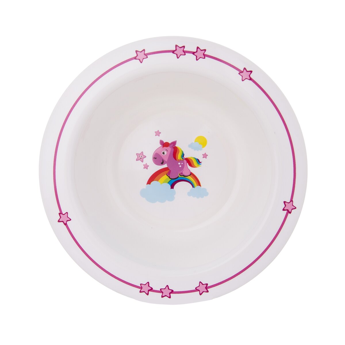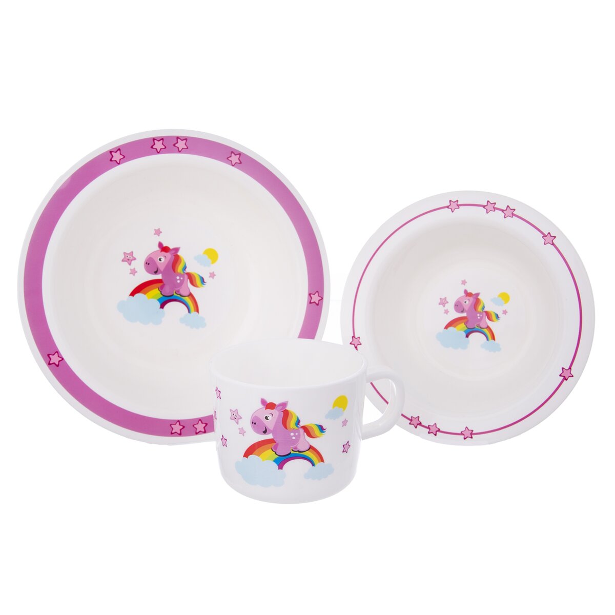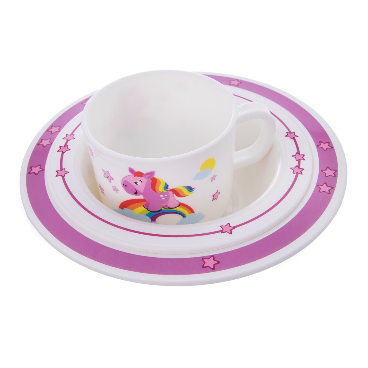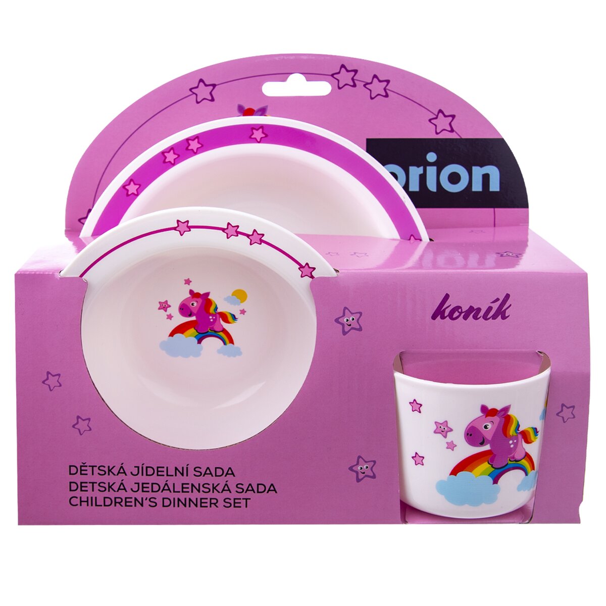 Růžový koník prohánějící se po nebesích. Proč stojí na duze? A kam asi utíká? Tato nebeská jídelní sada zaujme pozornost nejednoho malého strávníka.