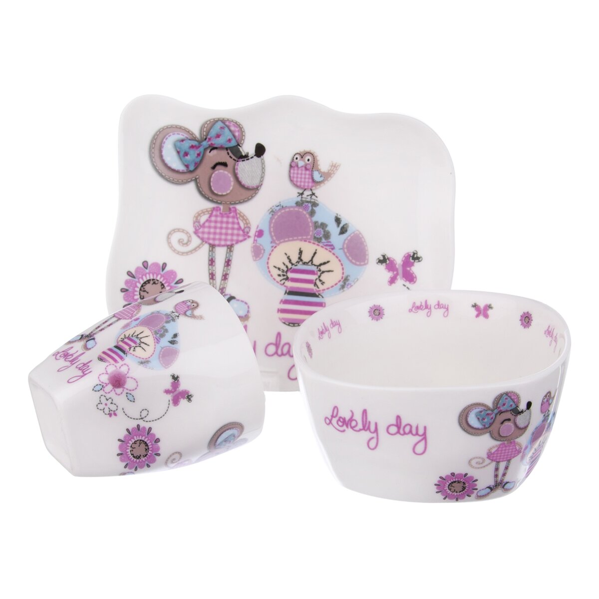 Krásná porcelánová jídelní sada s roztomilou myškou a růžovým nápisem, kterou si zamiluje i vaše dítě. Tvoří ji hrneček o objemu 200 ml, miska o rozměrech 12×12×5,5 cm a hranatý mělký talíř o rozměrech 17,5×15 cm.